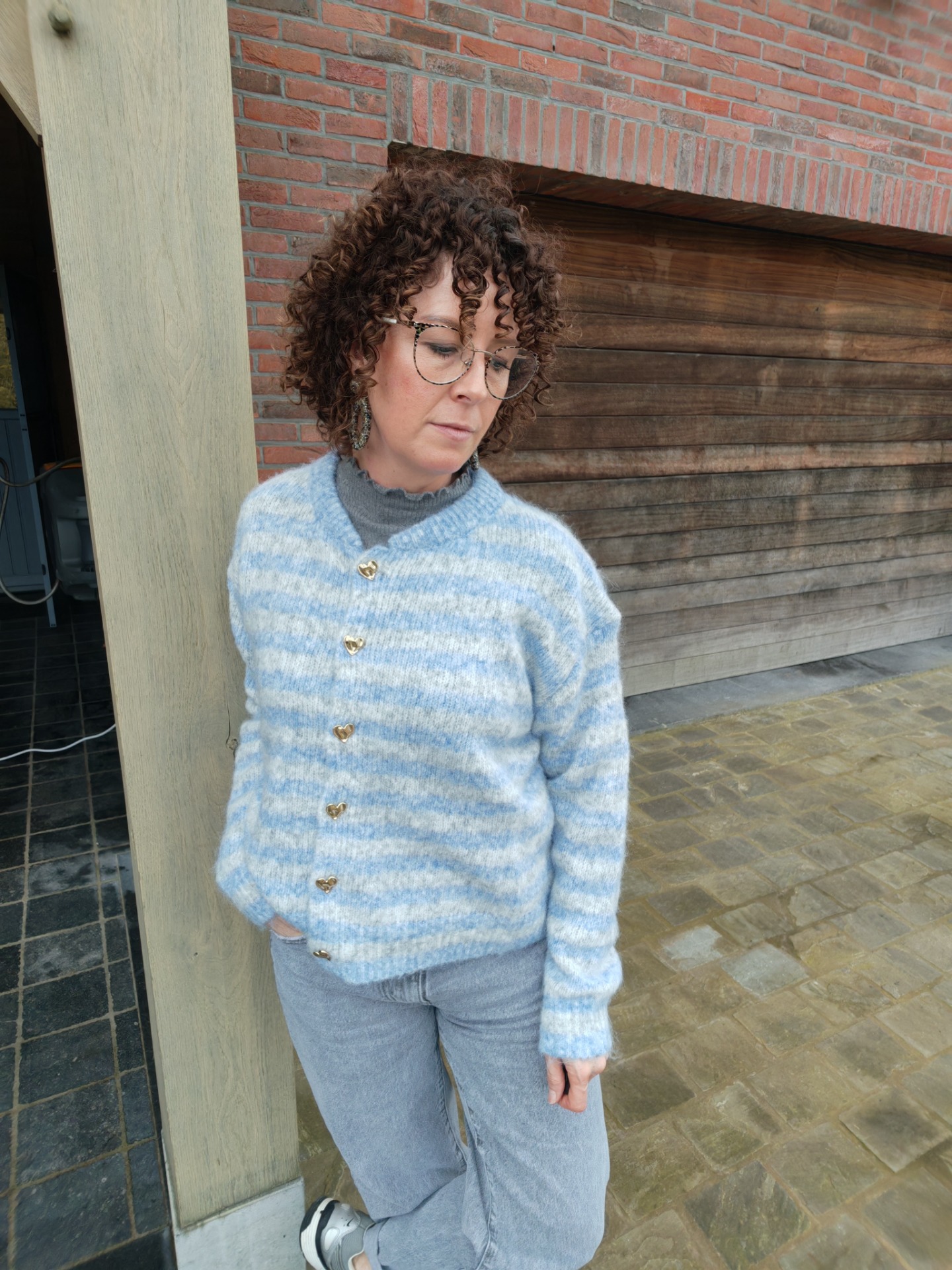 Cardigan met grijze en blauwe strepen, afgewerkt met gouden knopen in hartjesvorm.