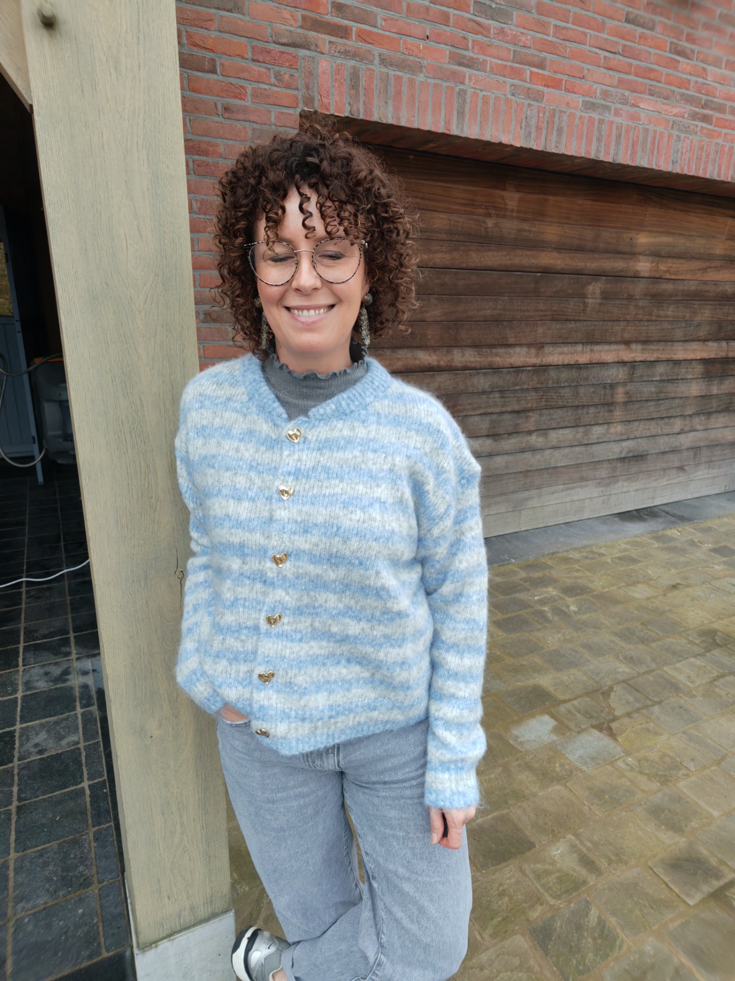 Combineer de cardigan met onze grijze of blauwe longsleeve en onze mom fit