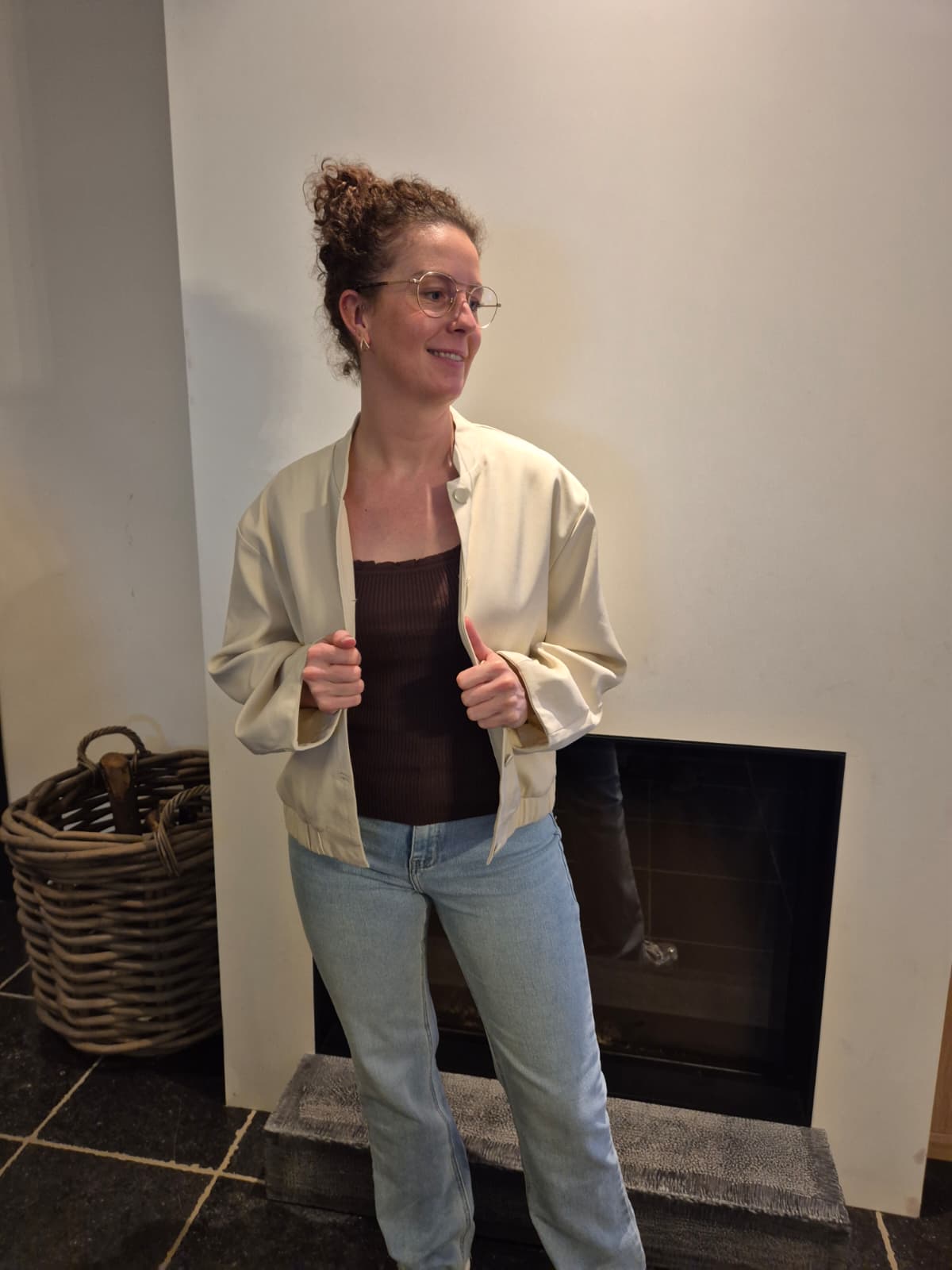Mooie beige bomber die zorgt voor dat tikkeltje meer.De bomber wordt hier gedragen met de straight leg lichtblauw en de bruine top.Hetty is 1m65 en draagt hier maat S