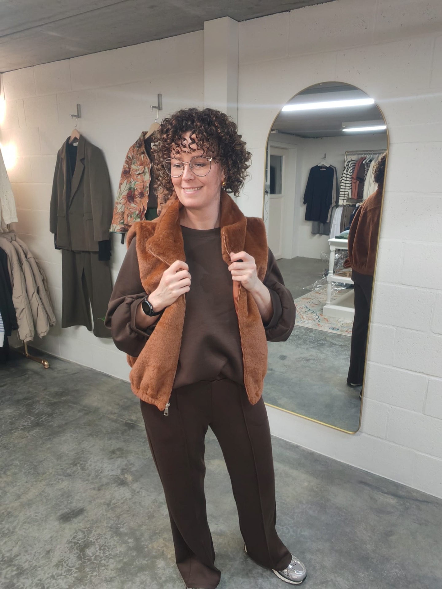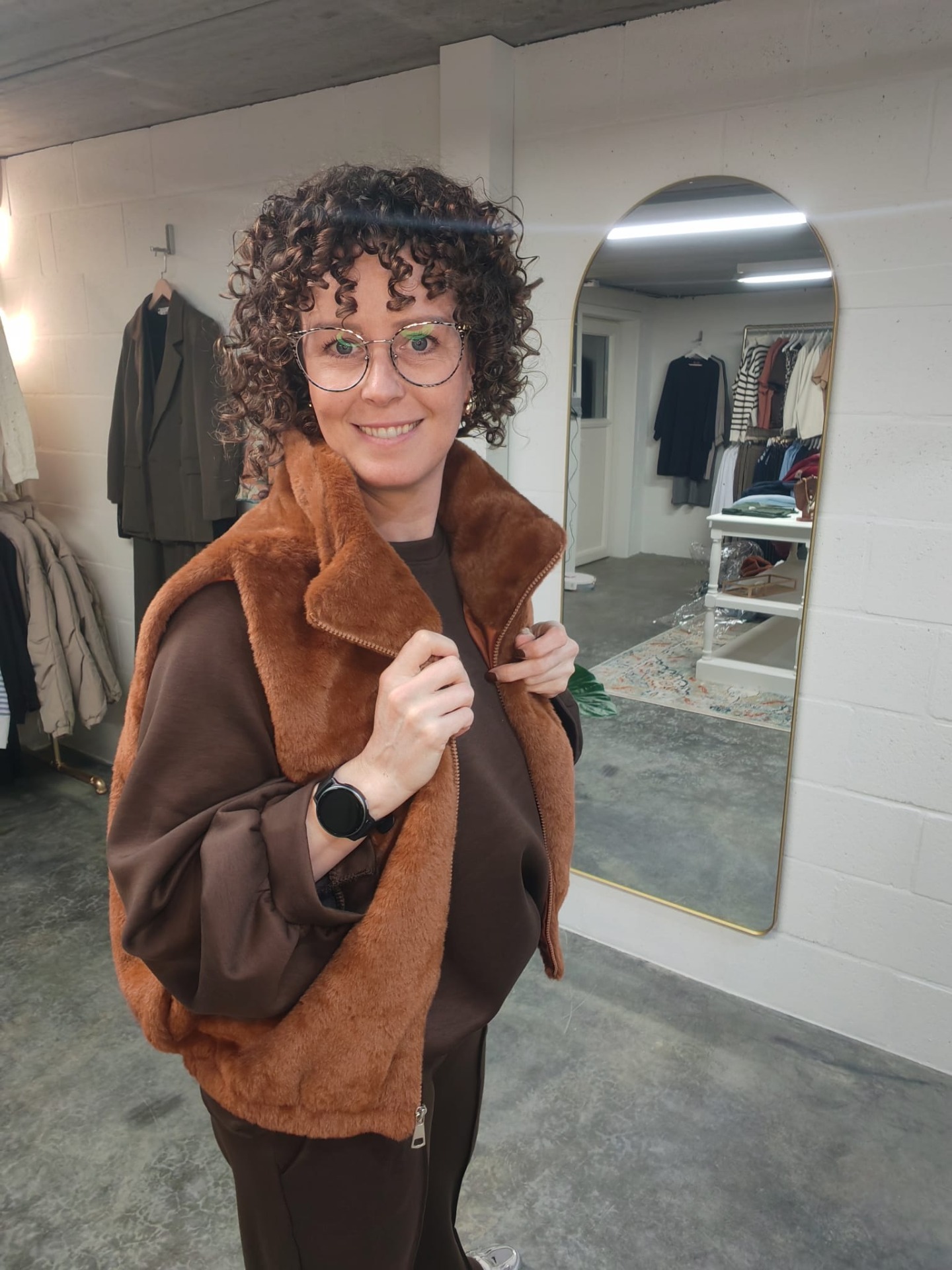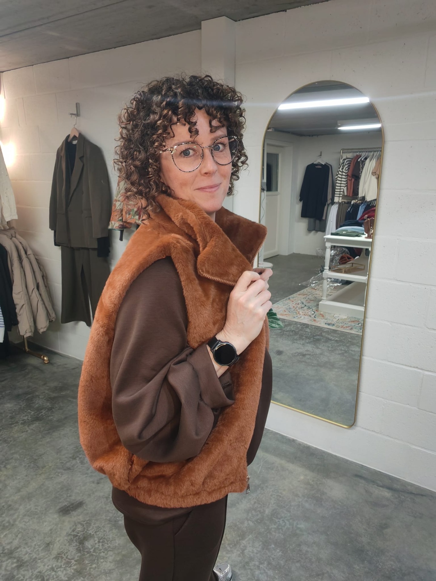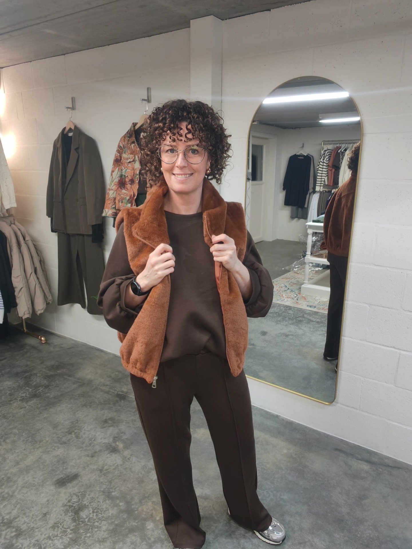 Leuk bontje dat voor extra warmte zorgt.Kan gecombineerd worden met een blouse, t-shirt, huispak of zelfs over een jasje.Hetty draagt het bontje hier met ons bruine huispak.
