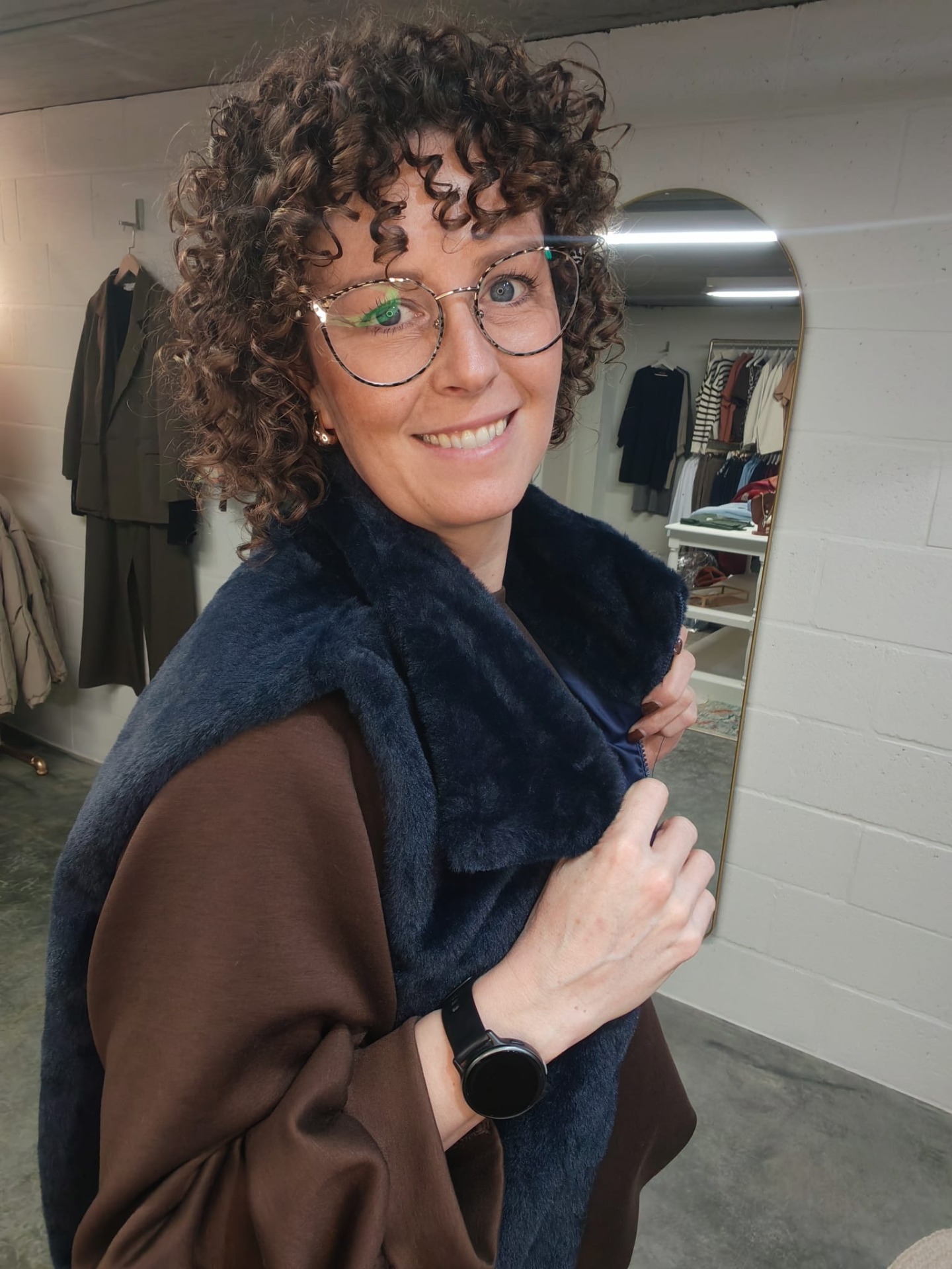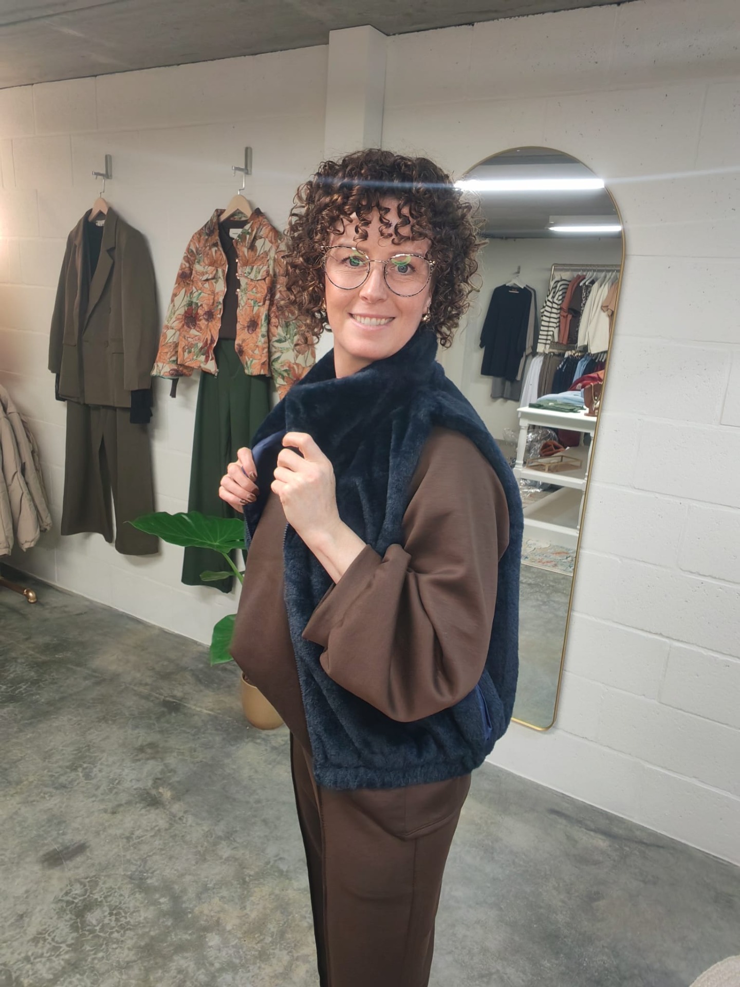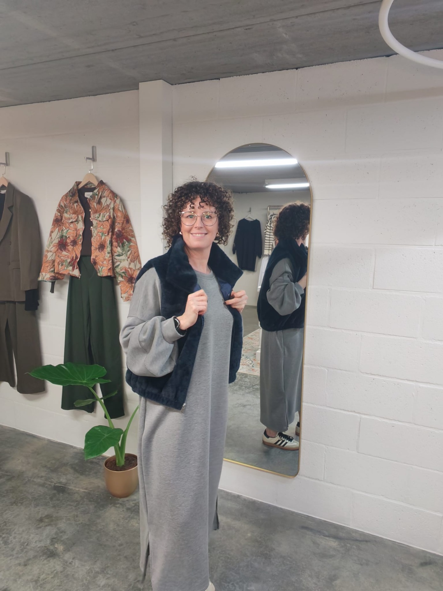 Leuk bontje dat voor extra warmte zorgt.Kan gecombineerd worden met een blouse, t-shirt, huispak of zelfs over een jasje.Hetty draagt het bontje hier met het lang grijs kleed en met ons bruin huispak.