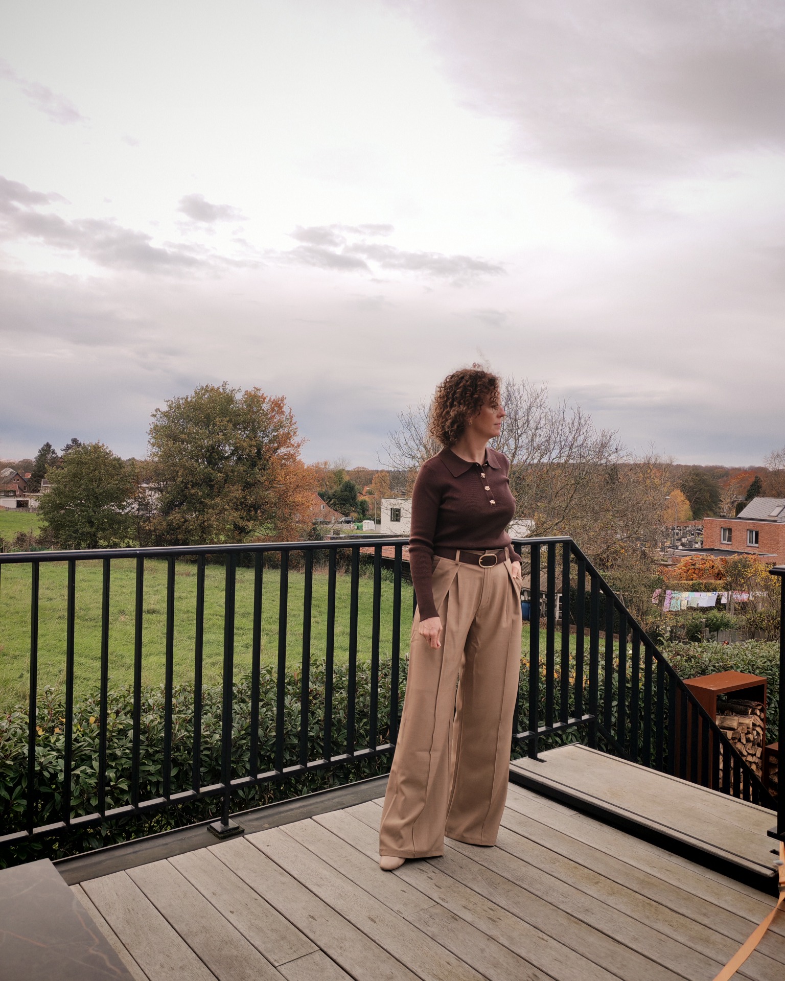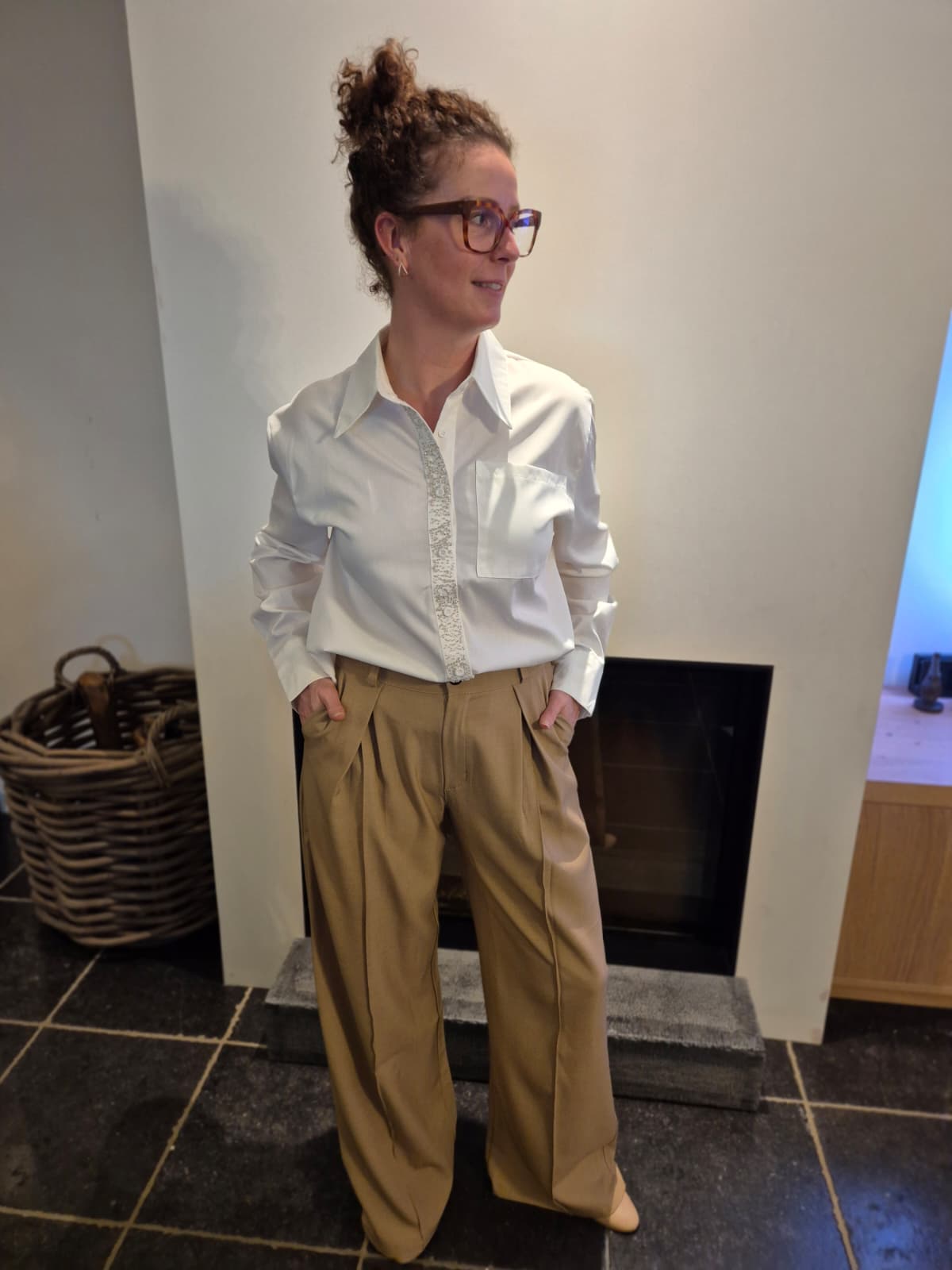 Beige broek met brede pijpen.Draag deze casual met een trui of iets gekleder met een hemd.Deze broek wordt geleverd met een riem.
