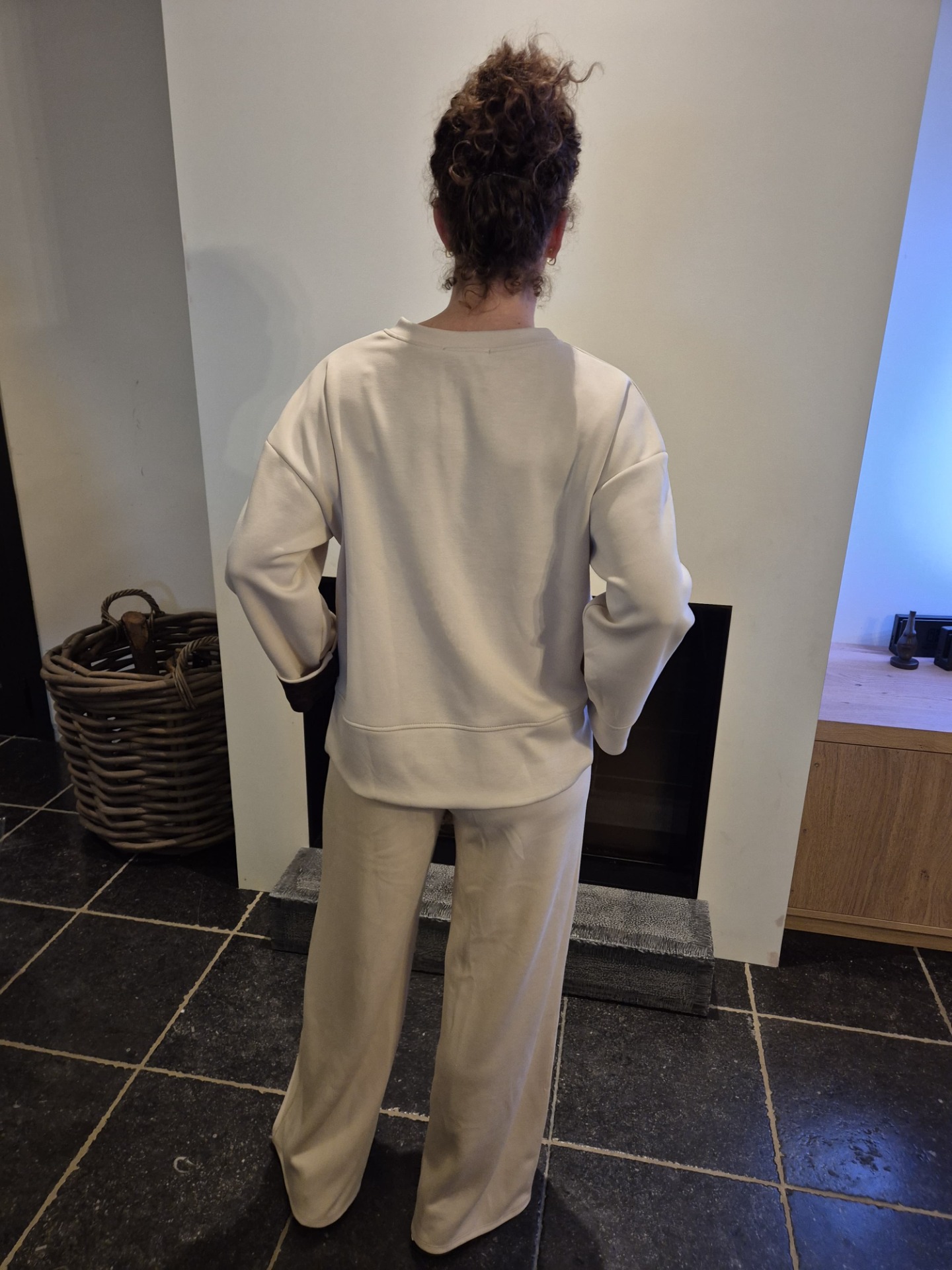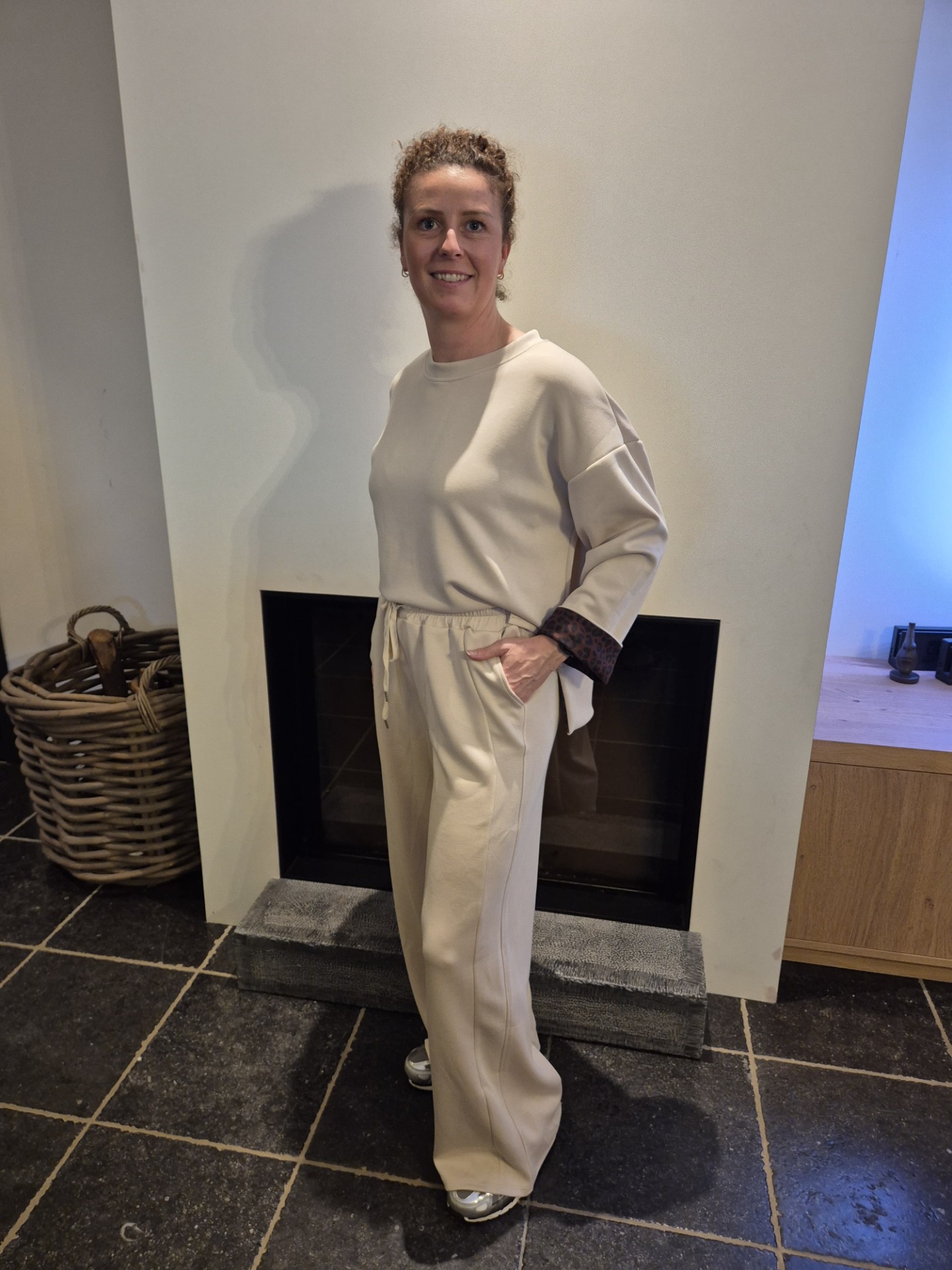Extra zachte broek met elastische band.De broek wordt hier gedragen met onze zachte beige trui, maar kan ook gecombineerd worden met onze zwarte trui of bruin t-shirt.
