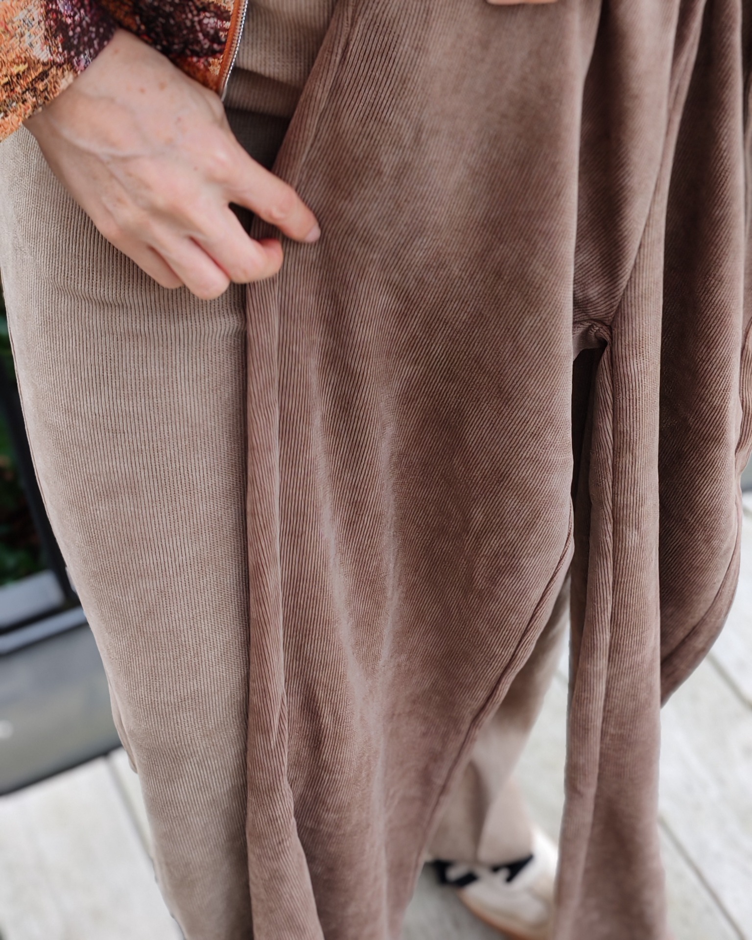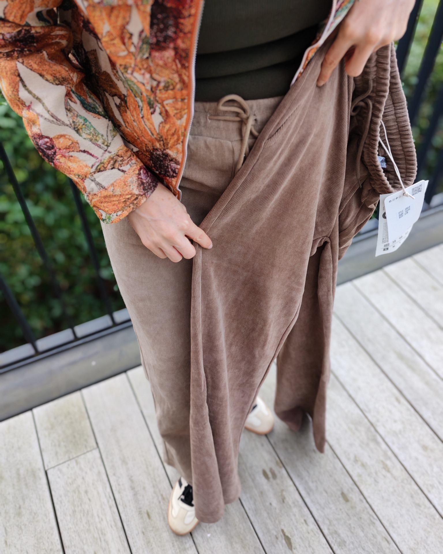 Broek uit velours in een taupe kleur.Het is de donkerste kleur van op de foto.Hetty draagt maat S.