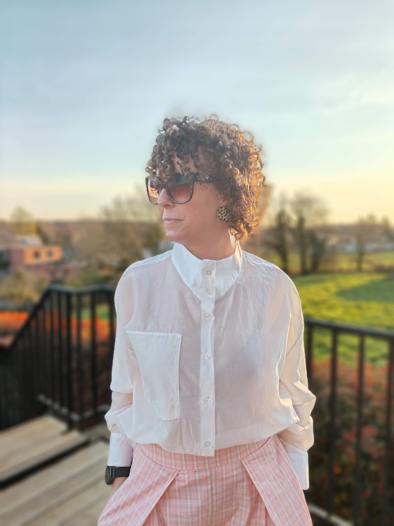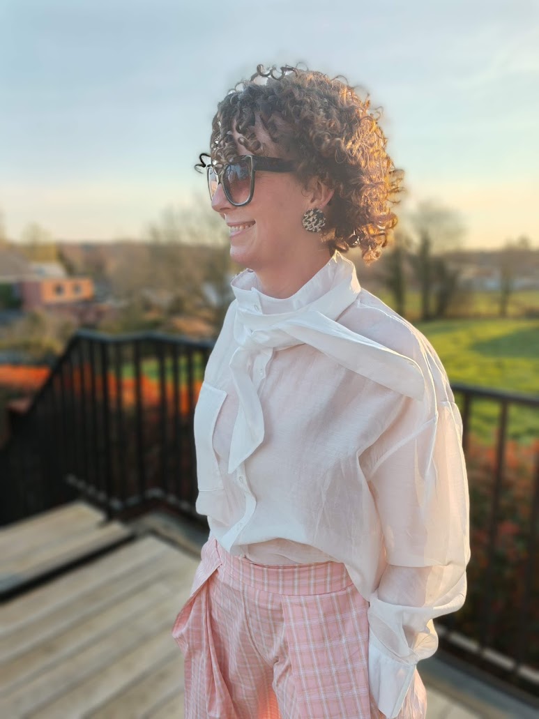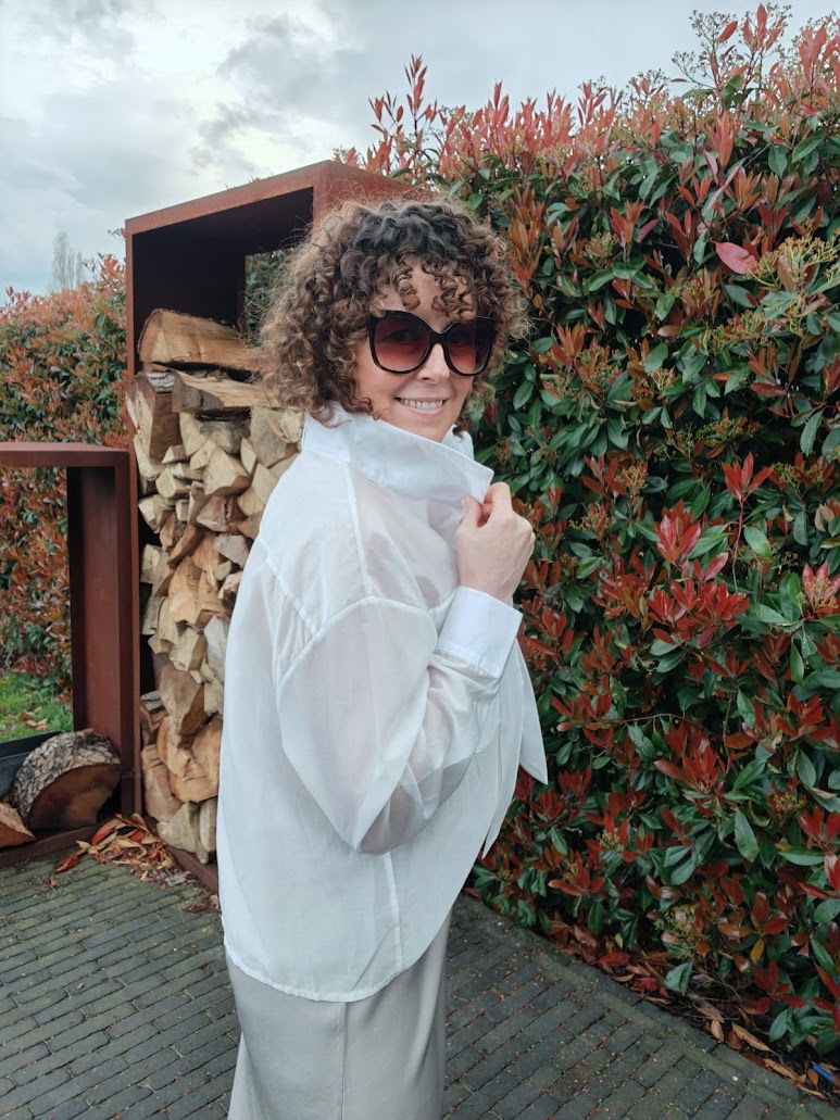 Deze blouse kan op meerdere manieren gedragen worden door de speciale kraag die je ook rechtop kan dragen.