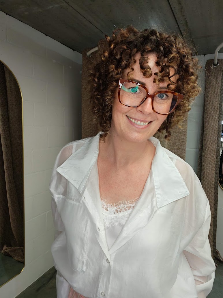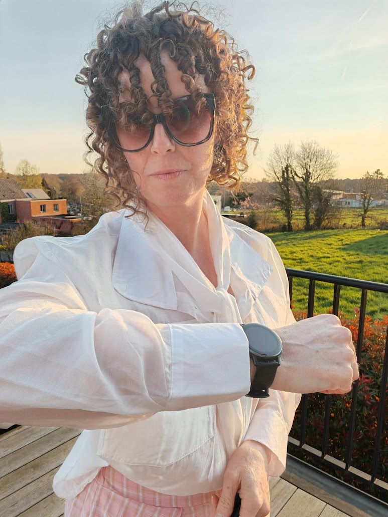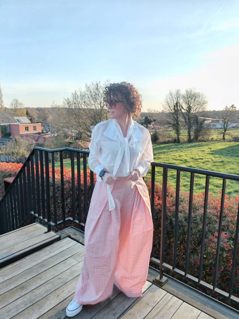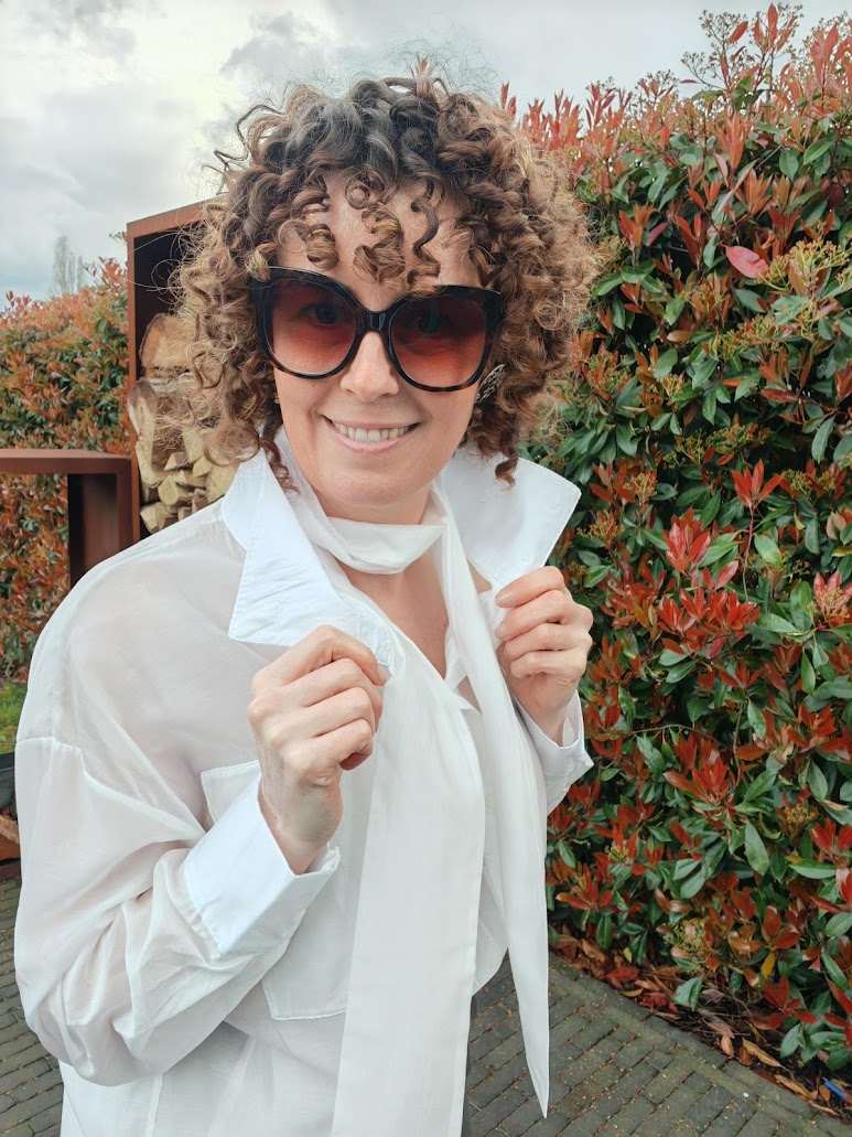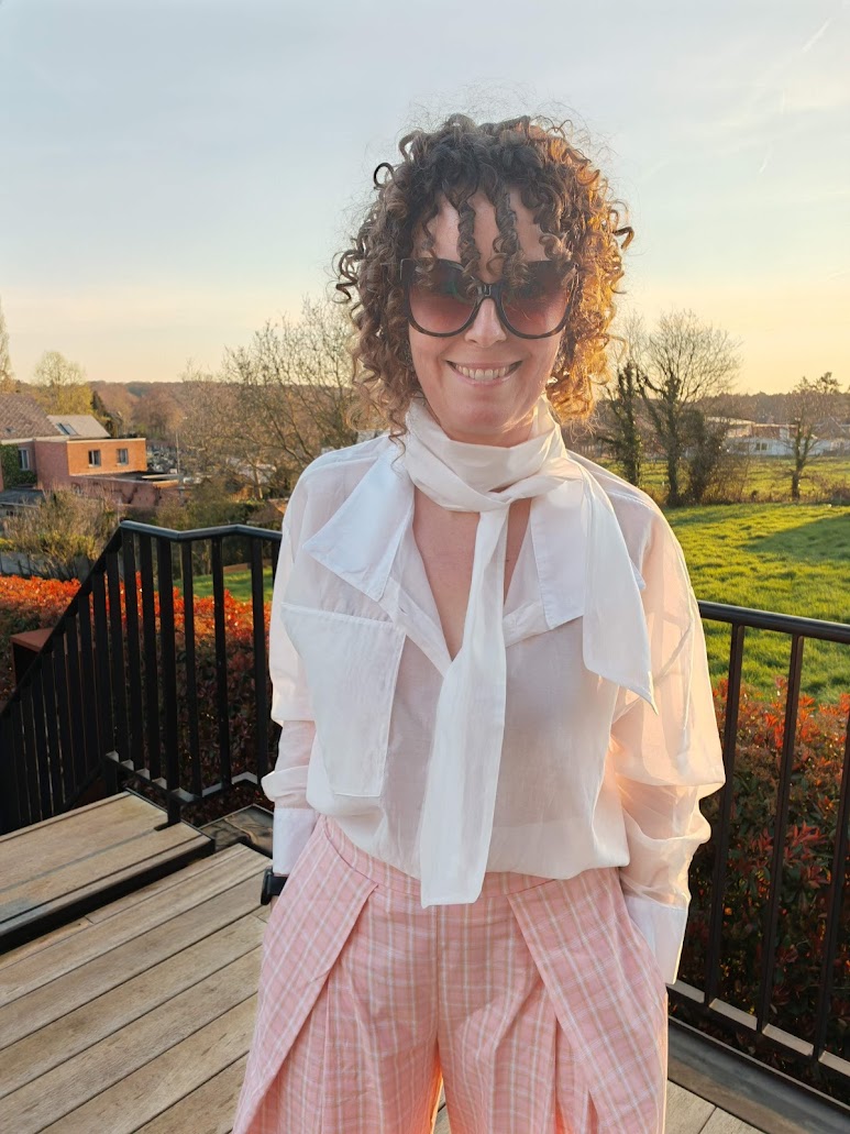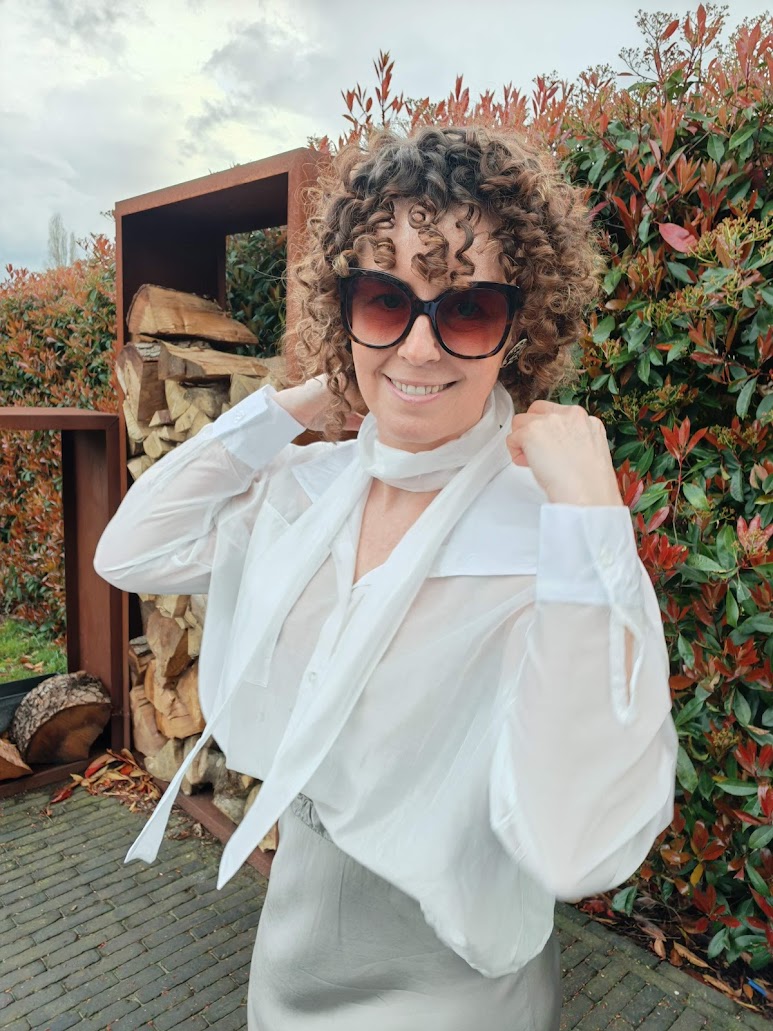Doorschijnende blouse die op verschillende manieren kan gedragen worden.