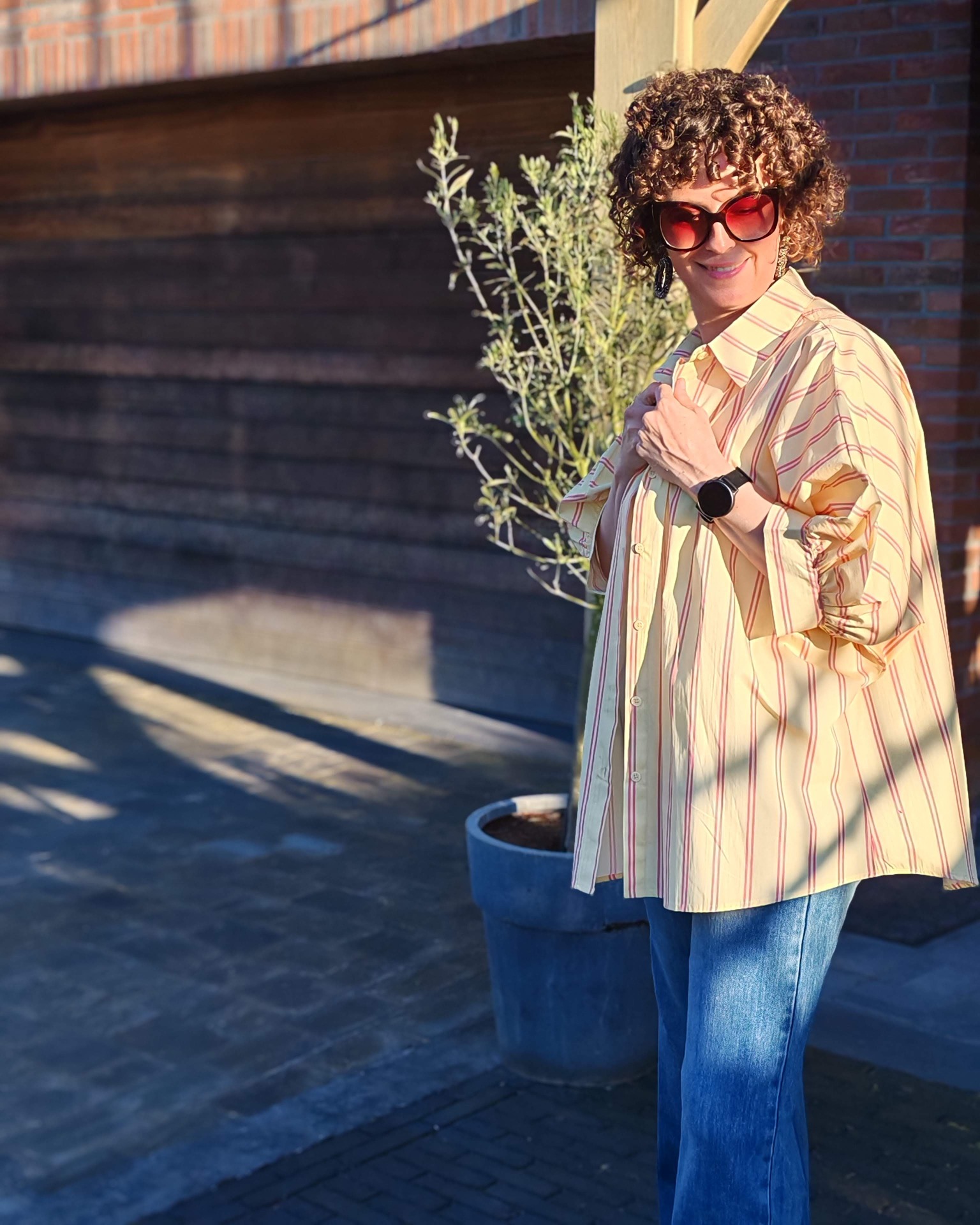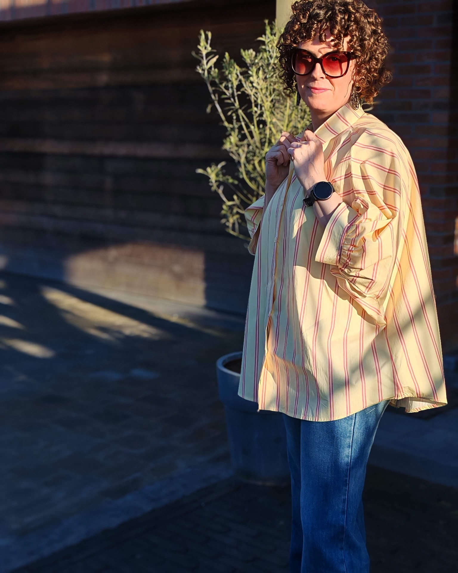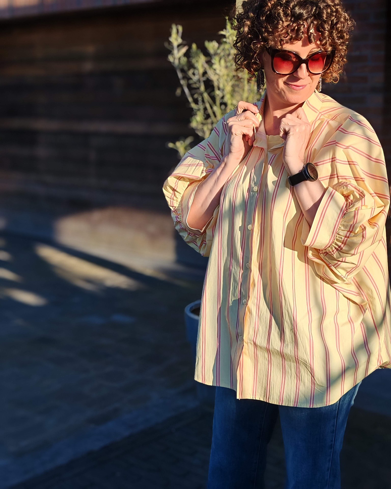 Supertoffe oversized blouse met strepen.Deze blouse valt vooraan iets korter dan achteraan en heeft losse korte mouwen.Je kan deze sportief combineren maar zeker ook gekleed met onze Assy blazer.
