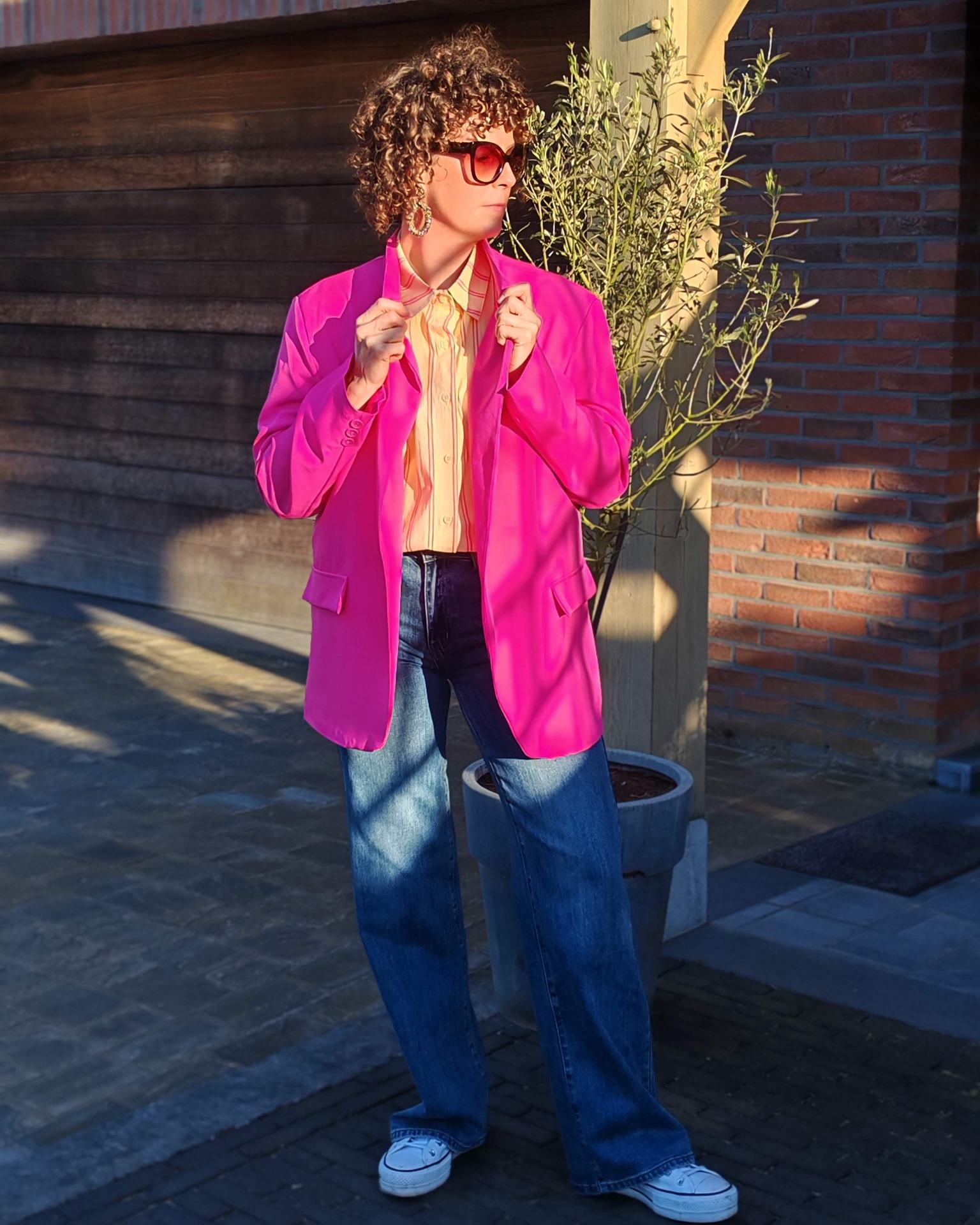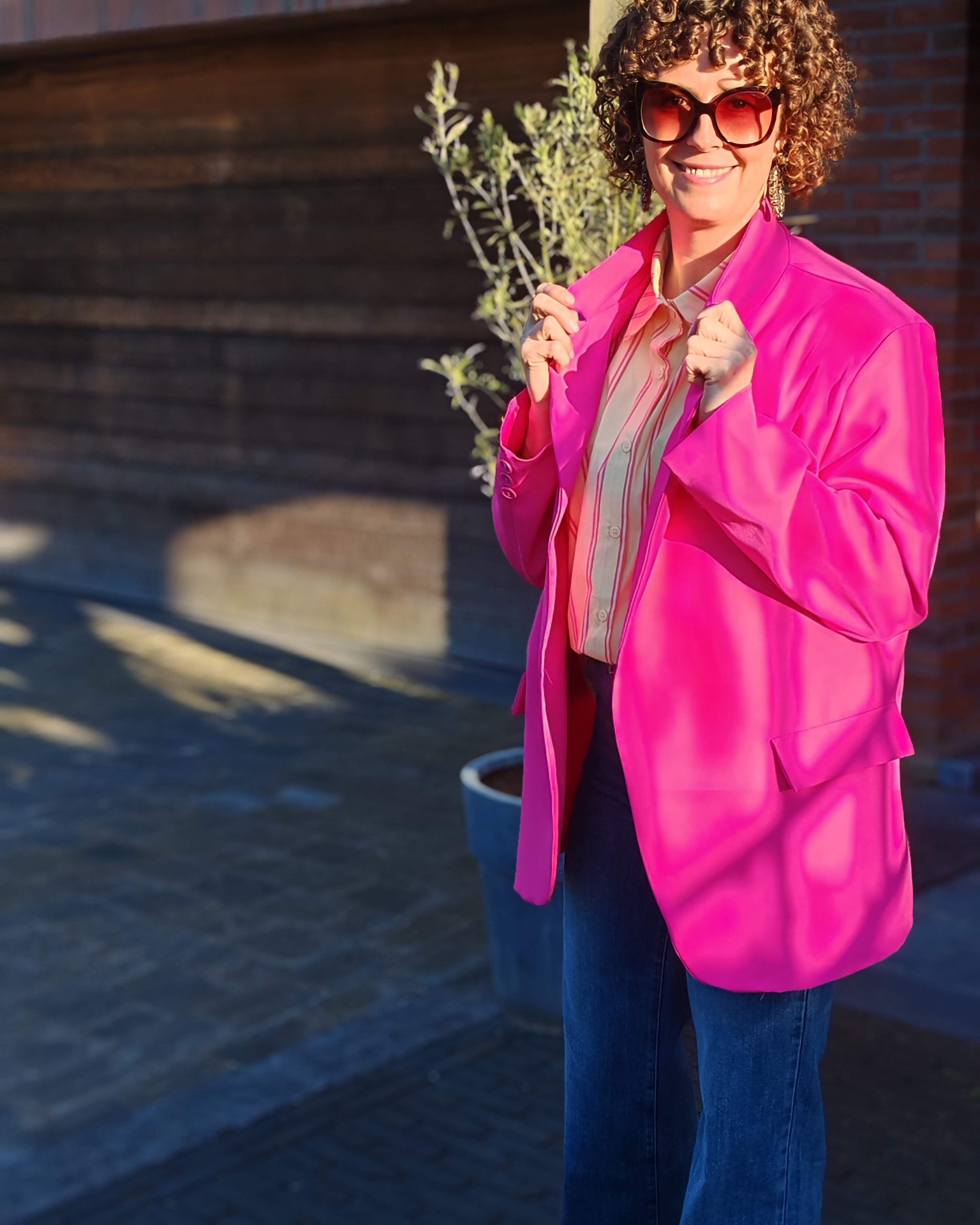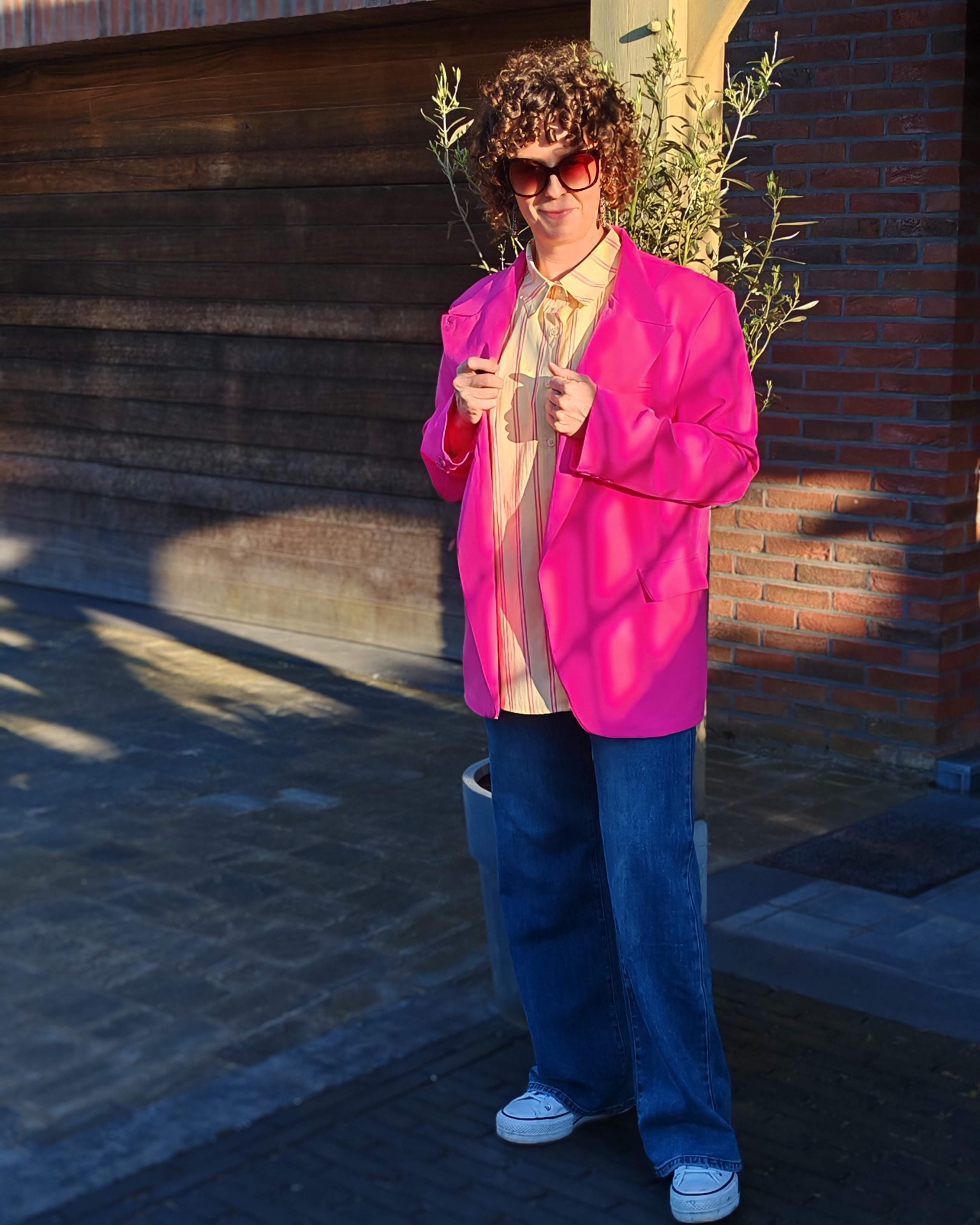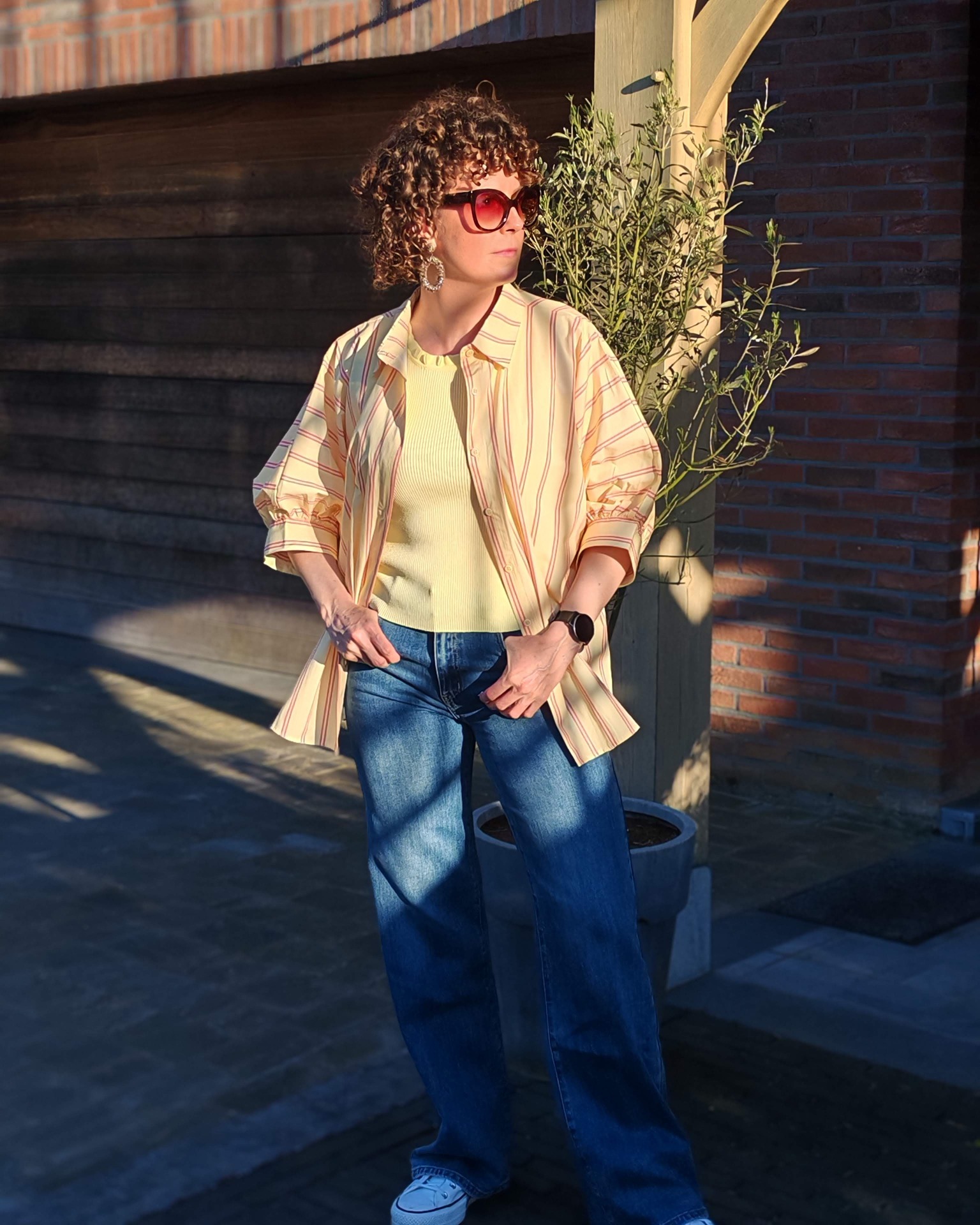 Supertoffe oversized blouse met strepen.Deze blouse valt vooraan iets korter dan achteraan en heeft losse korte mouwen.Je kan deze sportief combineren maar zeker ook gekleed met onze Assy blazer.