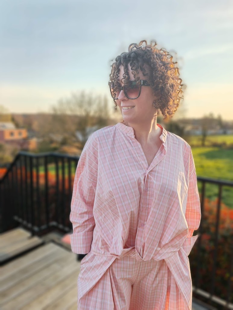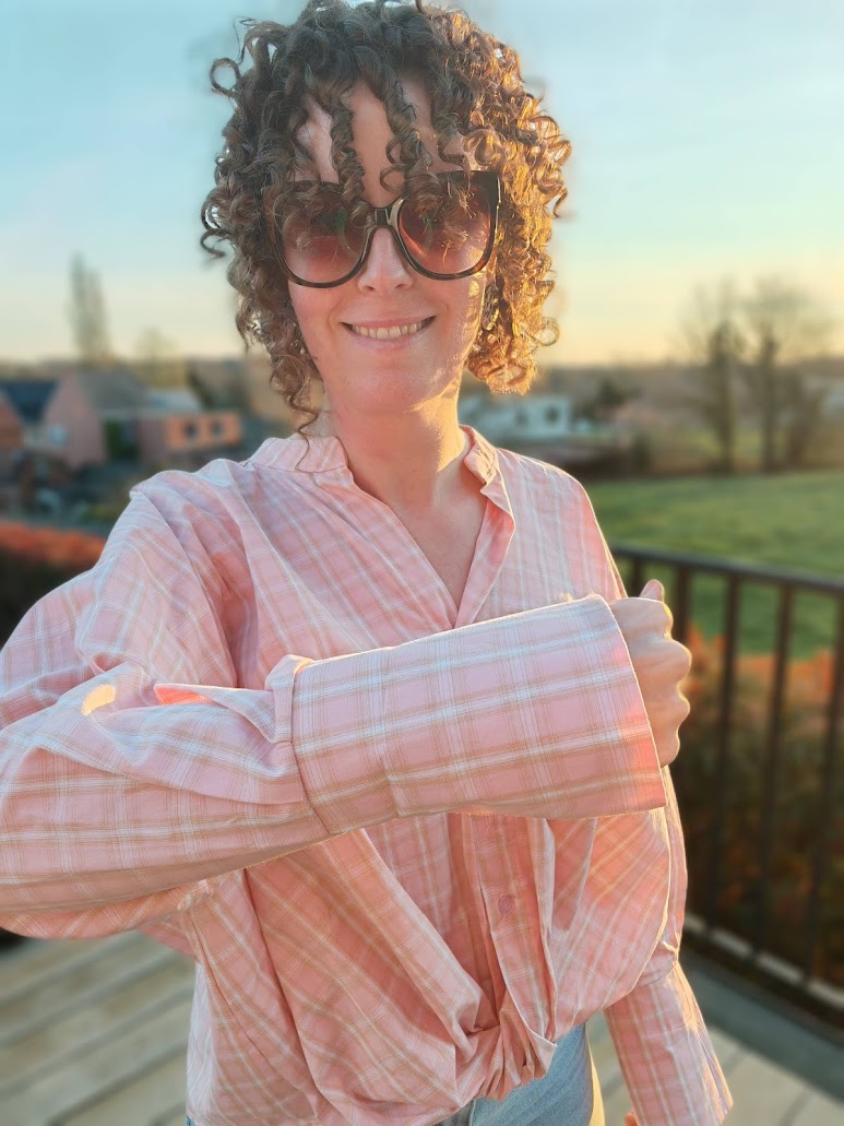 Toffe blouse in een ruitjespatroon met beige en roze.