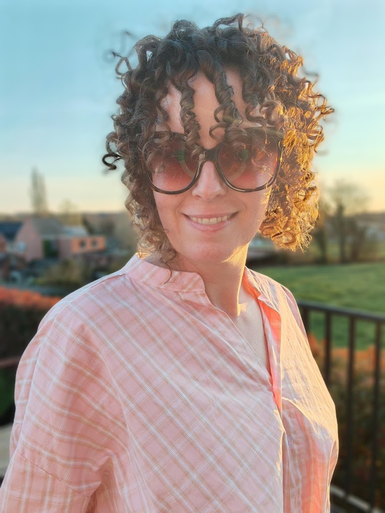 De blouse heeft een knoop onderaan, waardoor deze mooi op een broek valt.