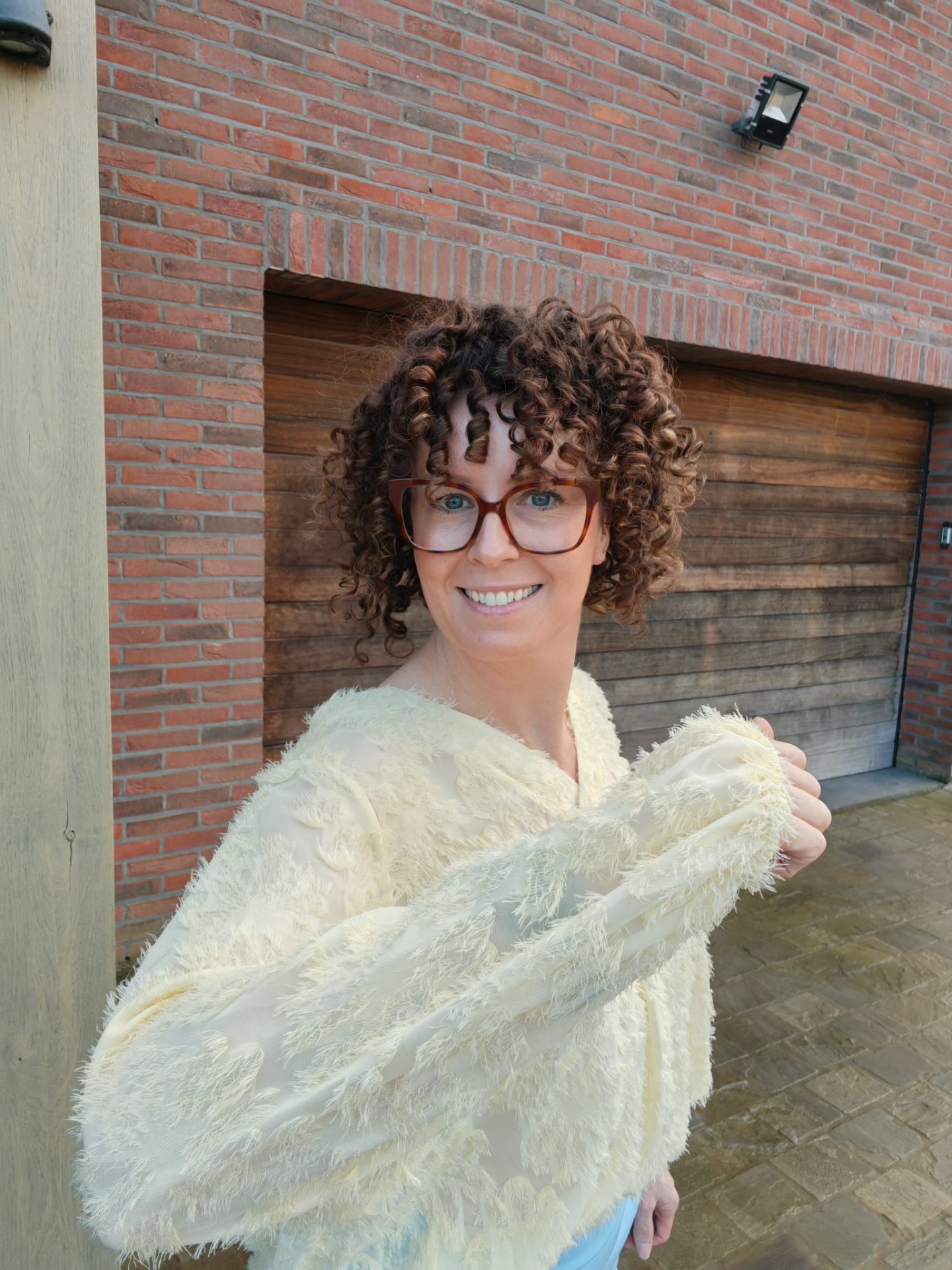 Blouse met een toon op toon motief van bloemen.De voorkant valt iets korter dan de achterkant en heeft een V-hals.De blouse is in 4 kleuren verkrijgbaar: blauw, roze, geel en beige.