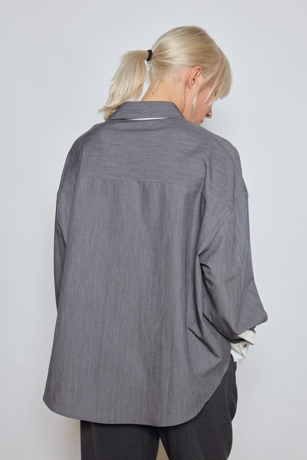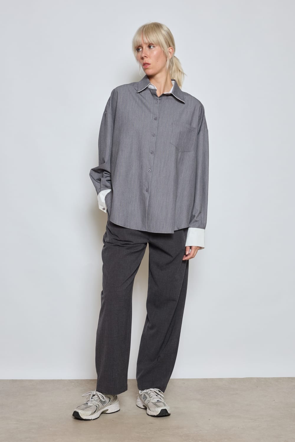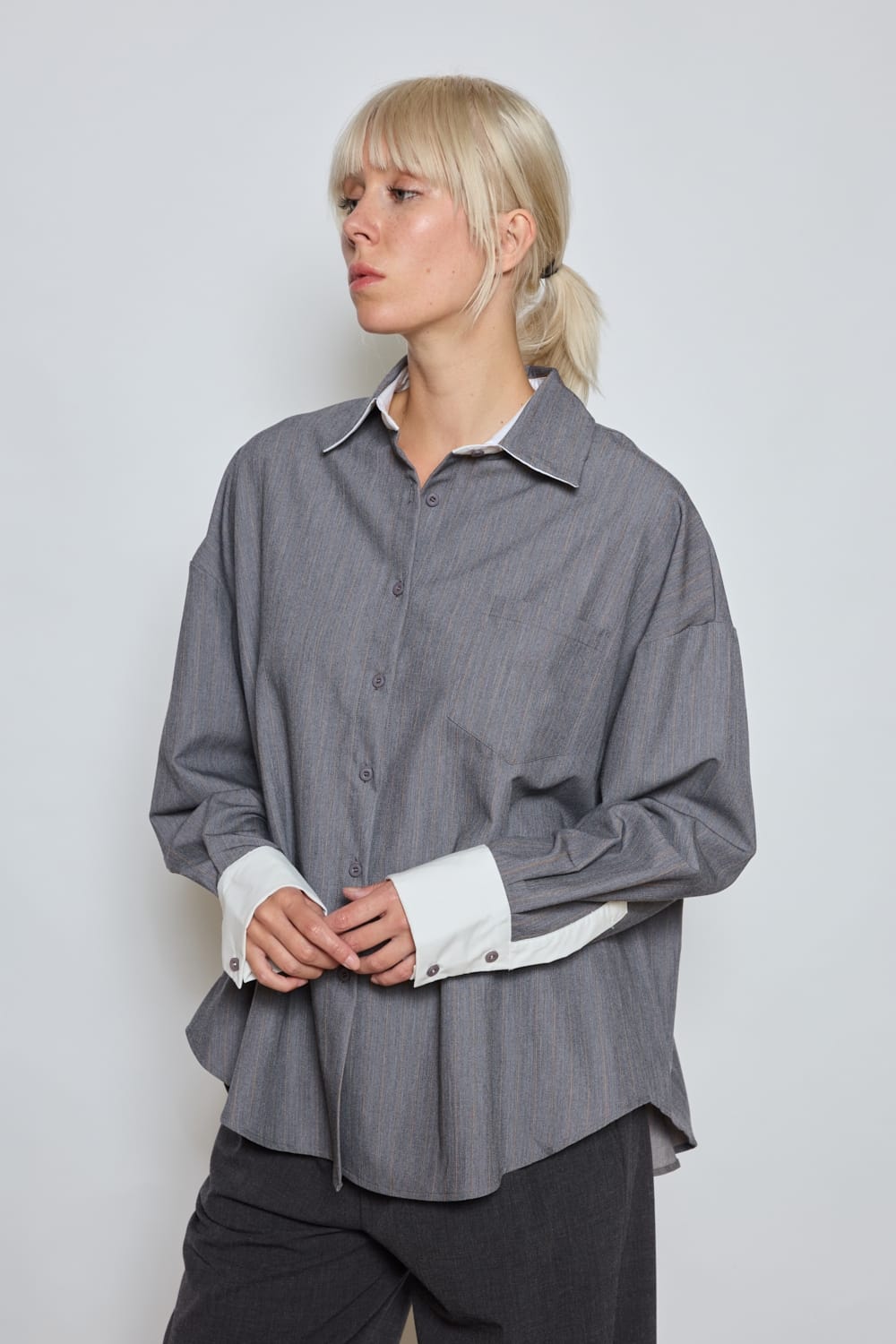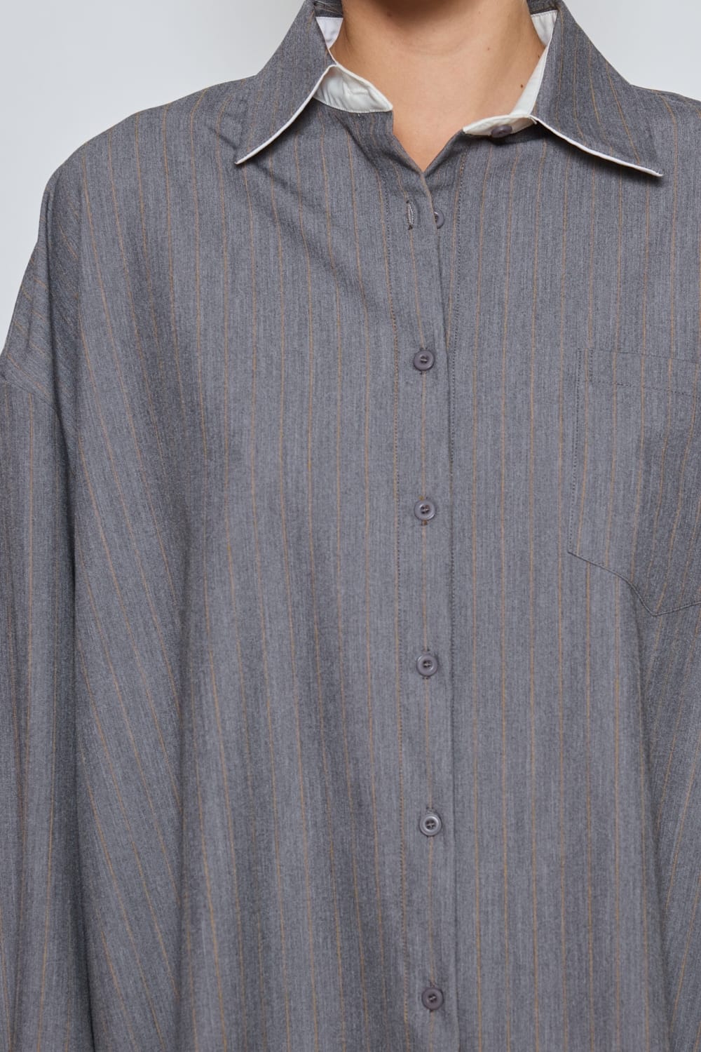 Soepelvallend hemd in een grijze kleur met een fijn streepje in oker.De mouwen hebben een witte boord die je kan omvouwen voor een casual look.Het hemd wordt hier gedragen met onze balloon jeans grijs.