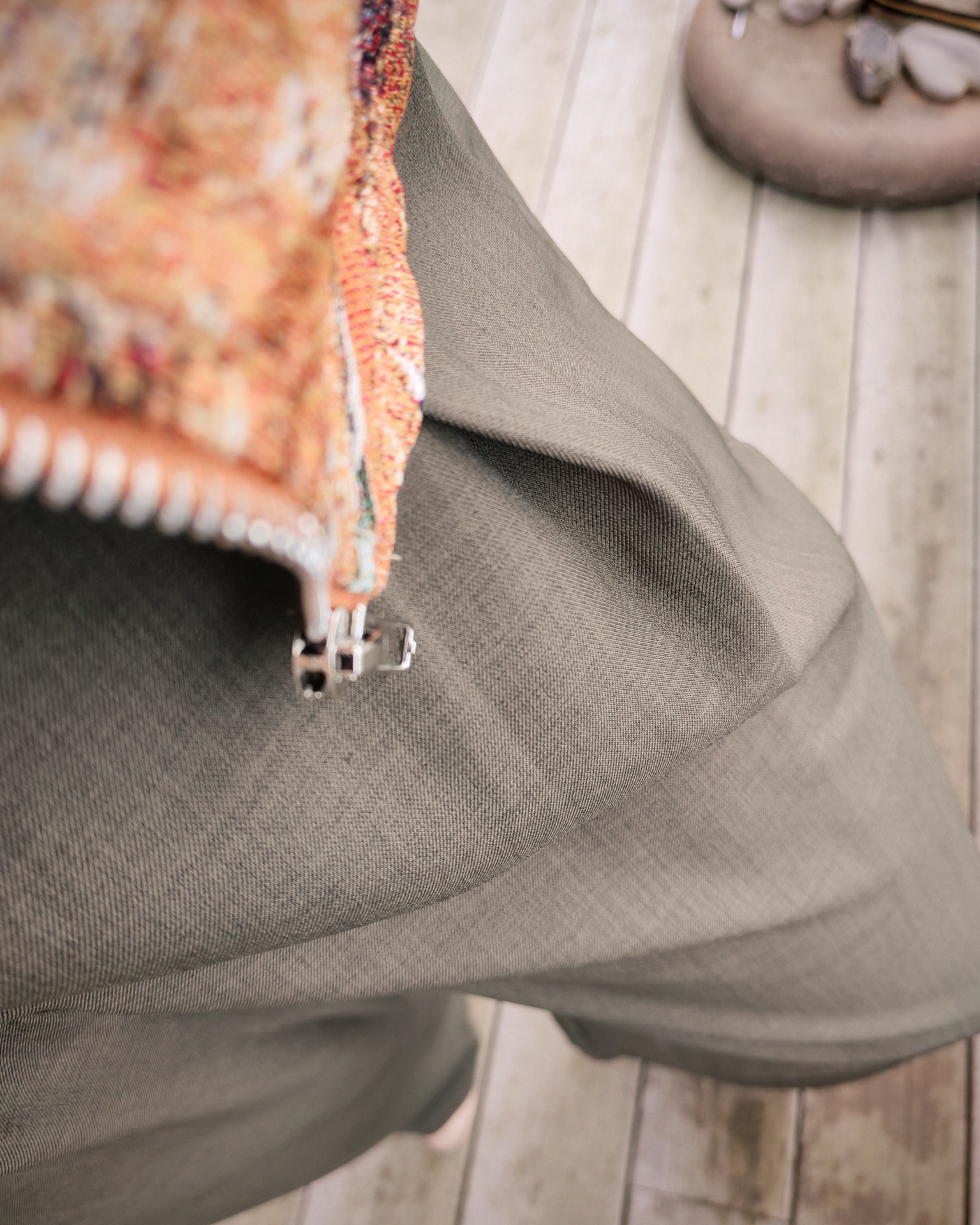 Een groene broek met bredere pijpen.De broek wordt hier gecombineerd met de kaki top en de gebloemde blazer.Bij de broek wordt een bruin riempje meegeleverd.