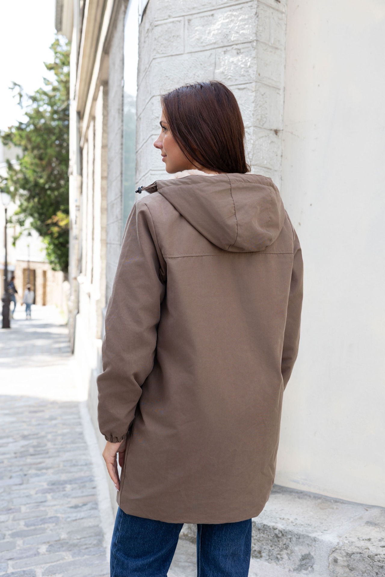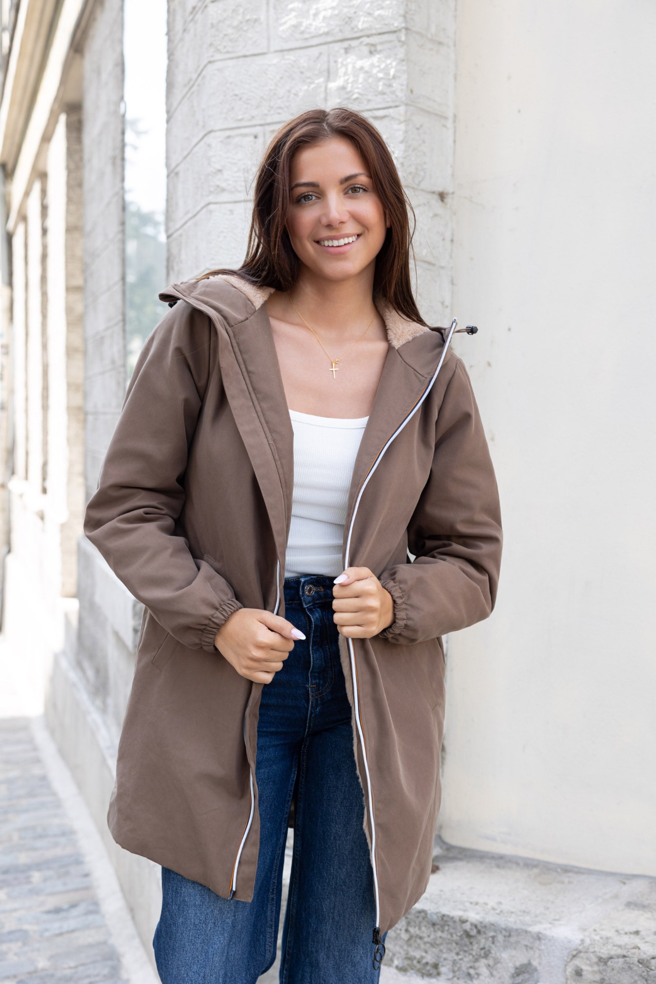 Recht model met capuchon, een dubbele ritssluiting met contrasterende bies, steekzakken aan de zijkant.