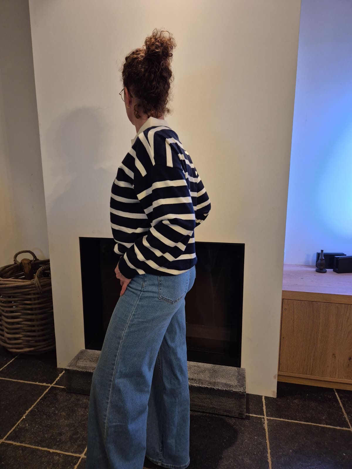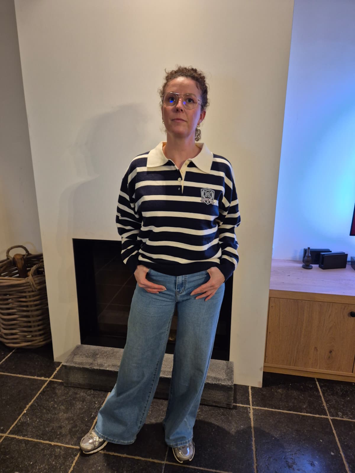 Toffe jeans met brede pijpen.Draag deze jeans met een sneaker of een hakje voor een avondje uit.Er zit een beetje stretch in dat ervoor zorgt dat ze aangenaam zit.Hetty is 1m65 en draag S/36