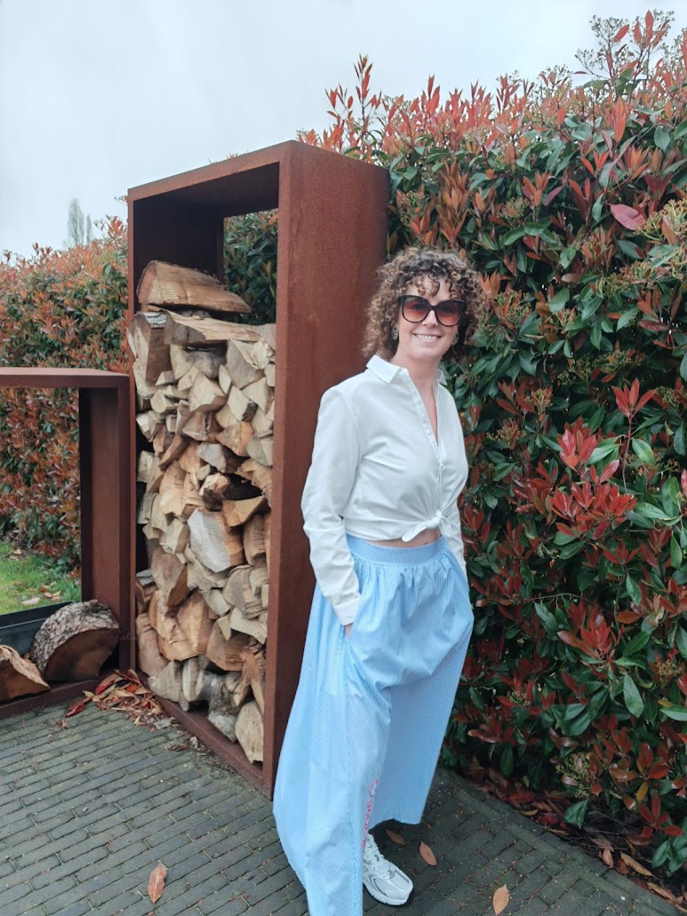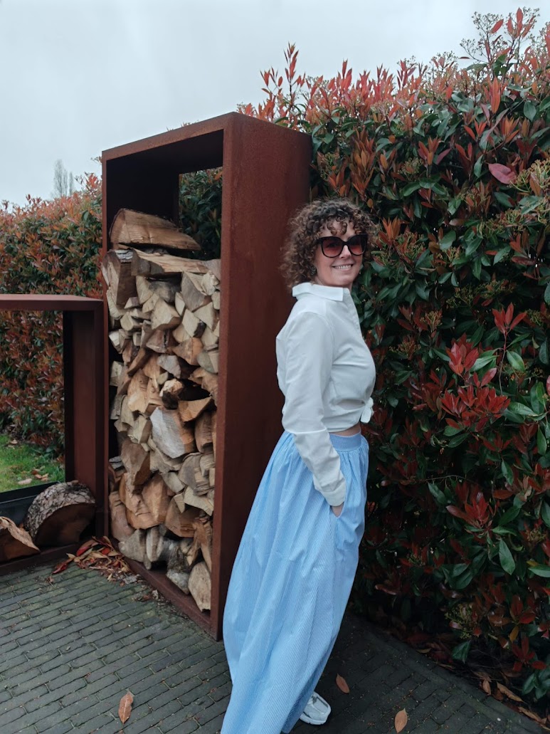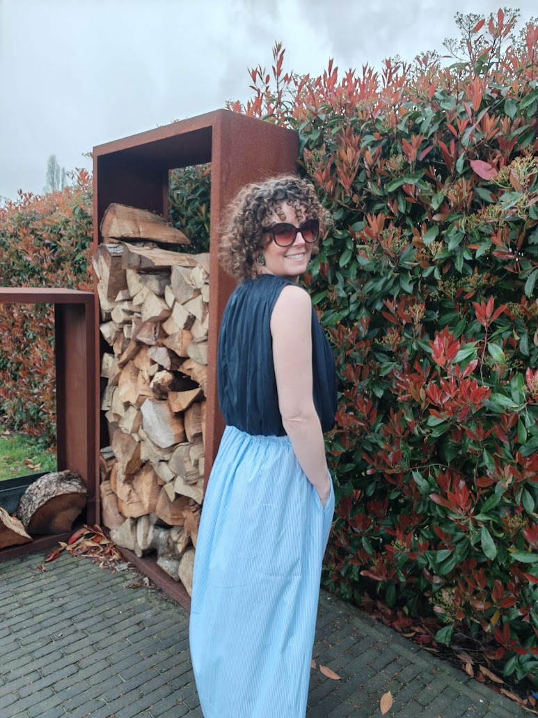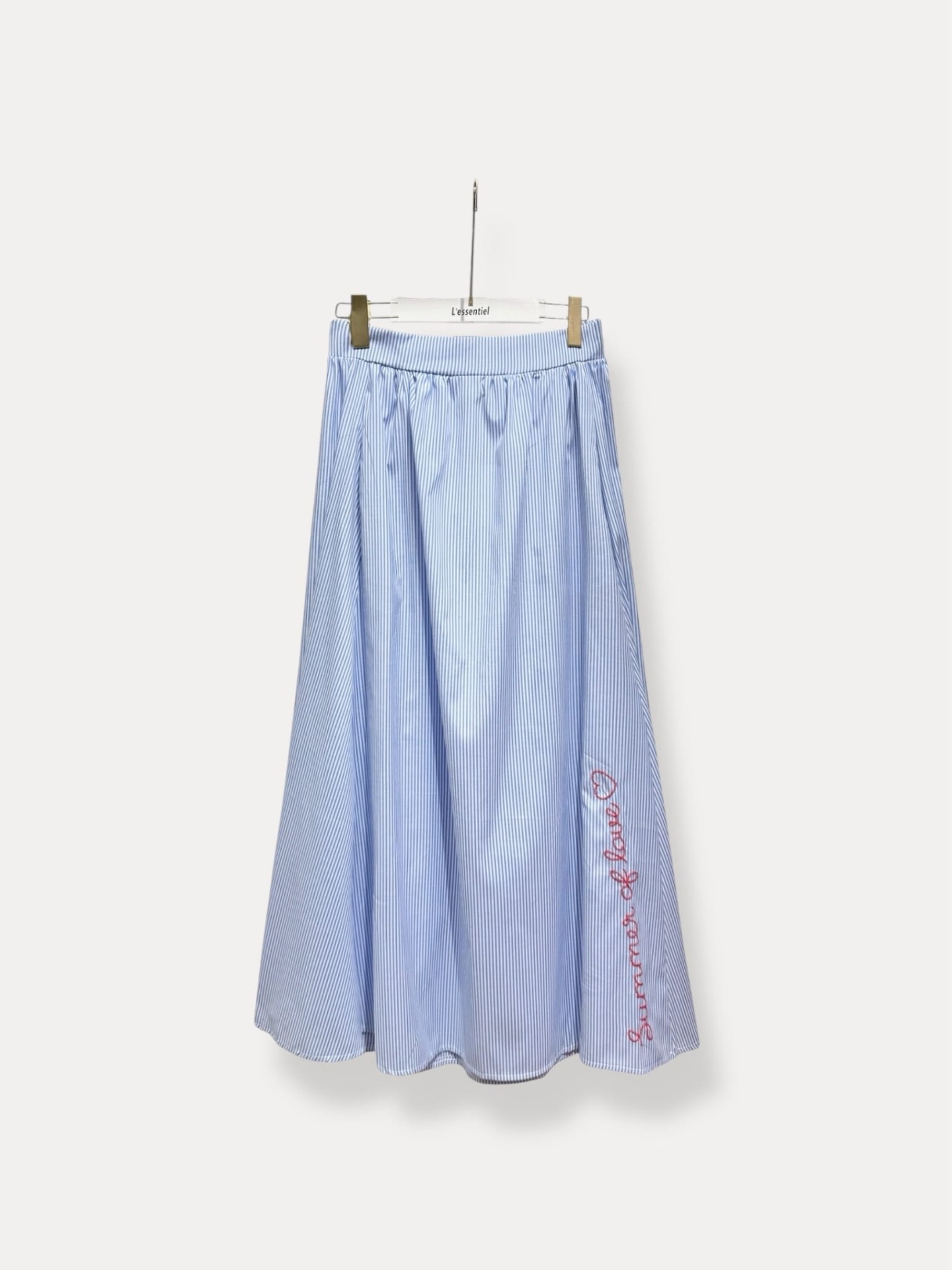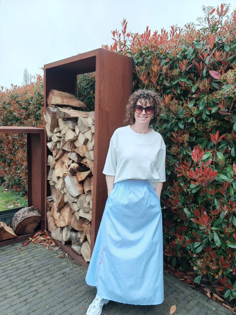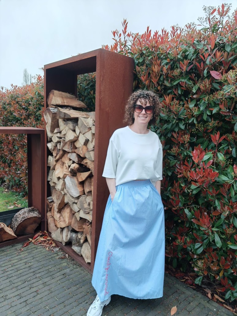 Soepelvallende lange rok met een fijn streepje in wit en blauw.Onderaan een leuk detail in rood "Summer of love).Combineer dit met ons Kato shirt, onze Tess top of ons Pure hemd.