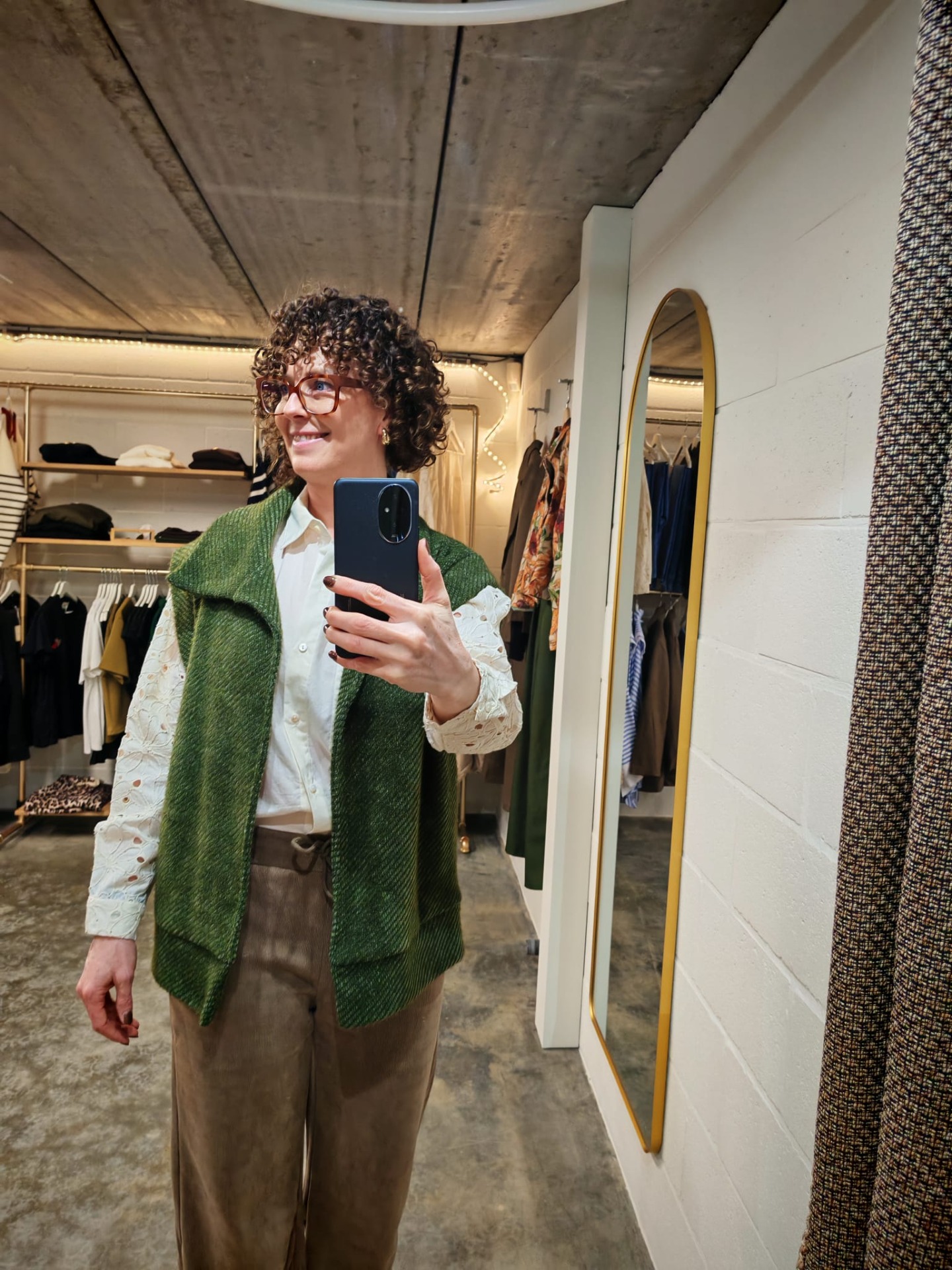 Toffe mouwloze vest in een kaki kleur.Deze vest kan je een jaar lang doordragen.Draag deze op een t-shirt, blouse, trui of jasje.De vest wordt hier gecombineerd met onze beige polo en velours broek.