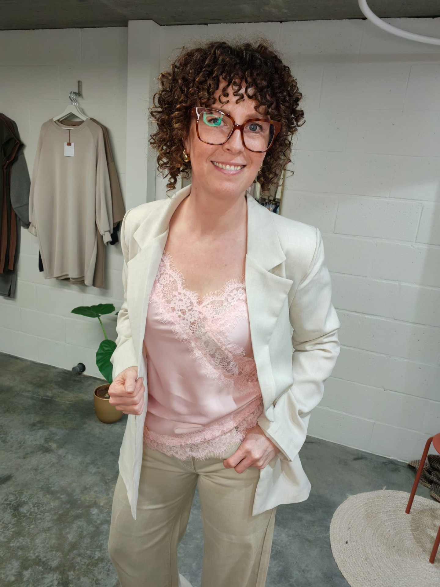 Soepele broek in een crèmekleur.Deze broek is van Lyocell, wat maakt dat ze heel luchtig en fris aanvoelt.Ze valt redelijk lang.
