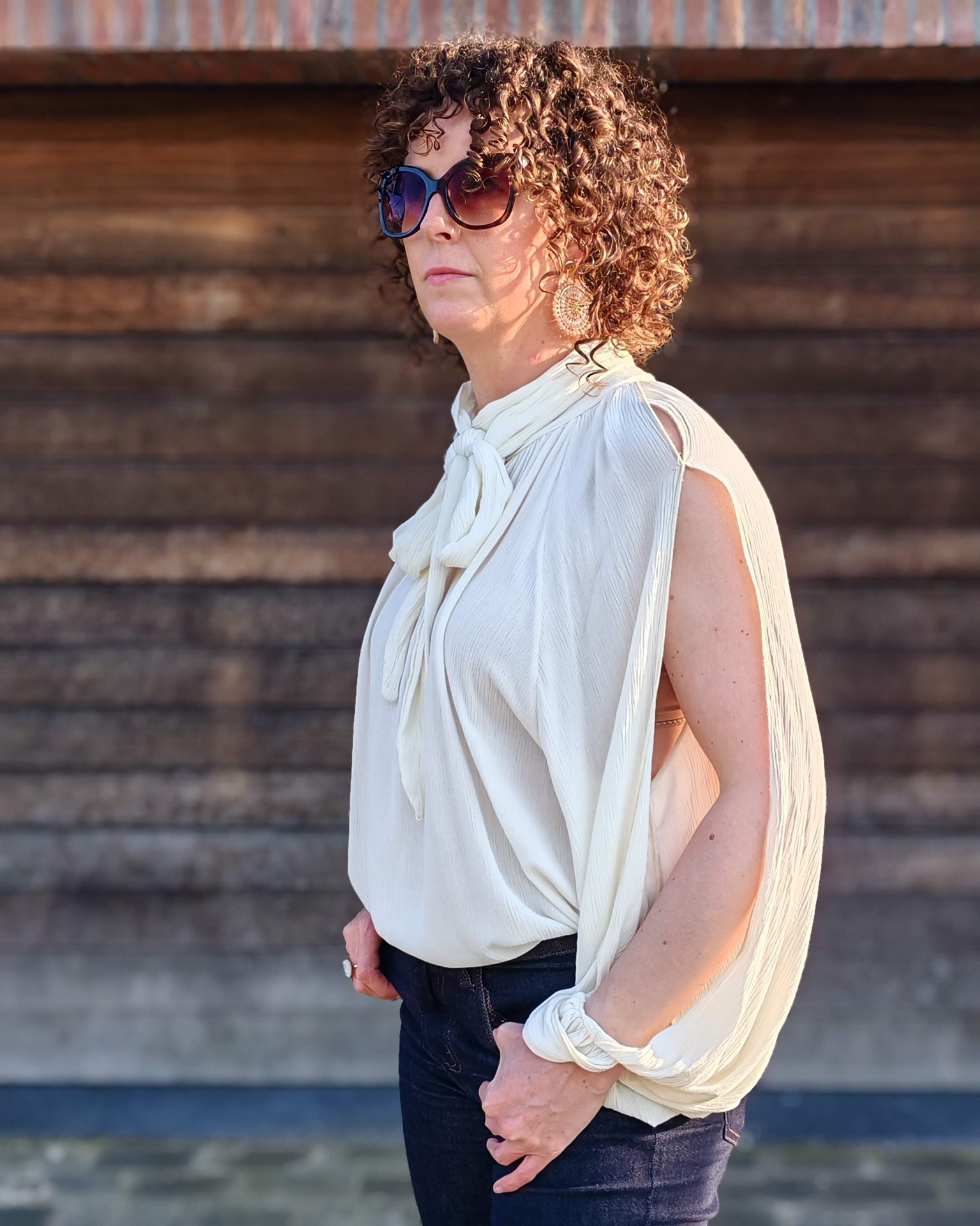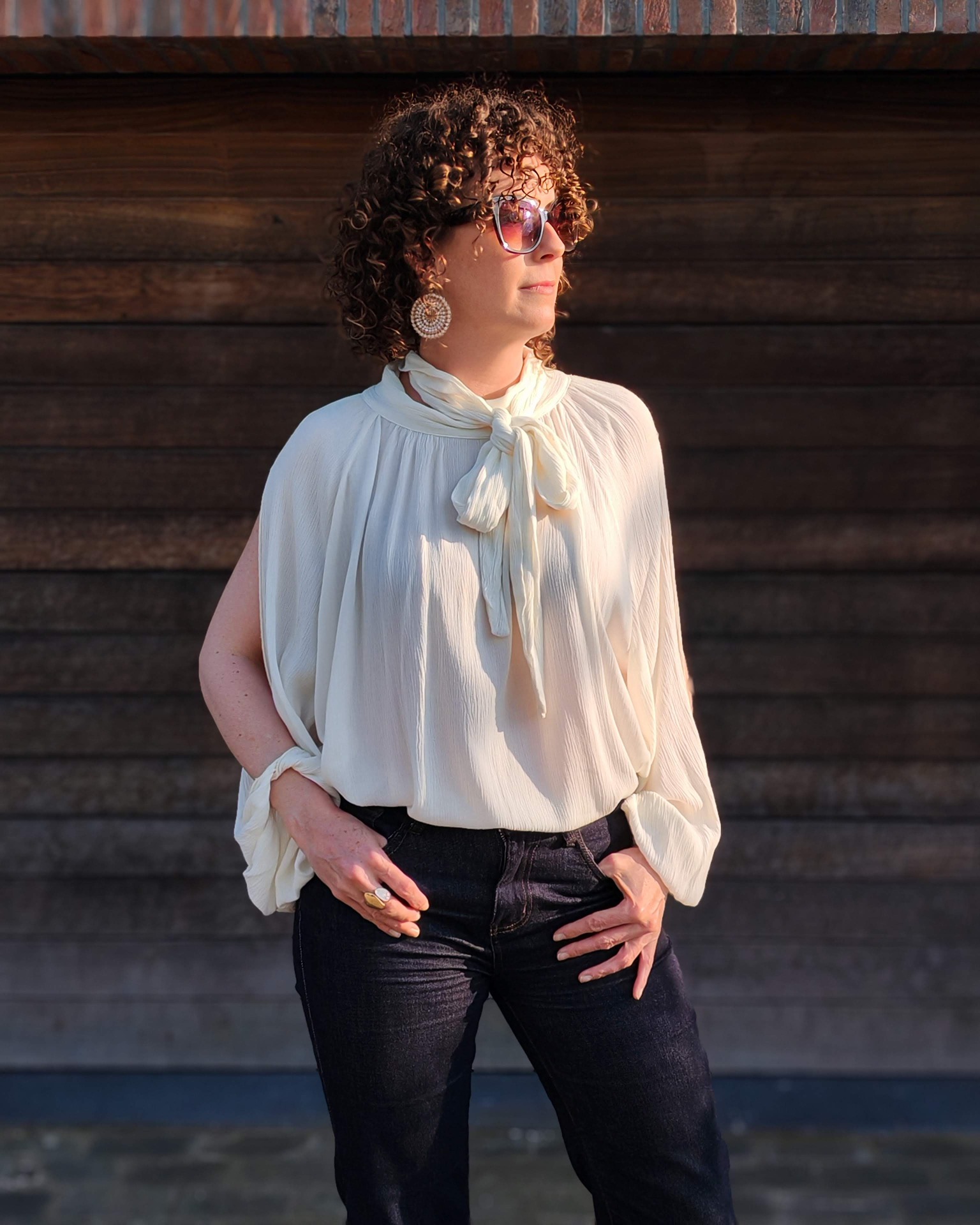 Draag de blouse los of in je broek en werk af met enkele leuke juwelen.