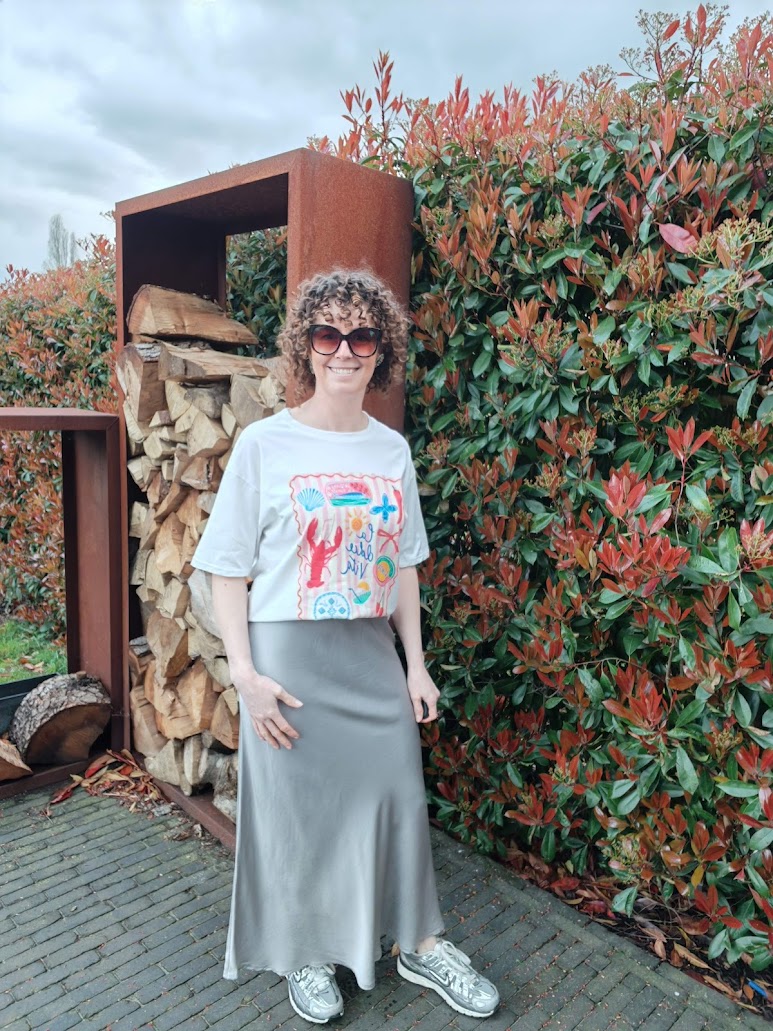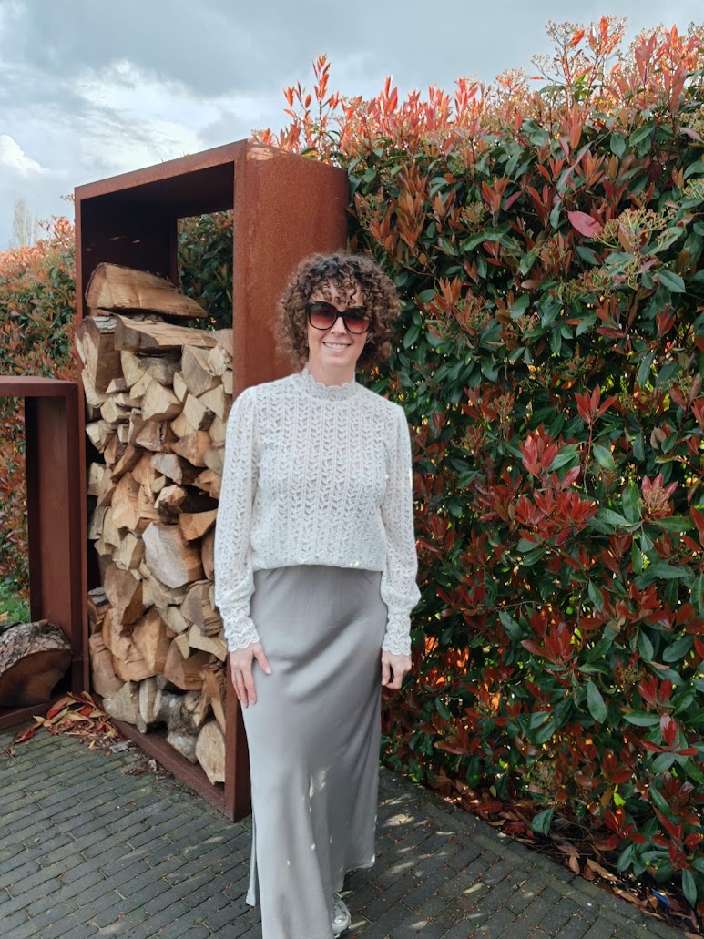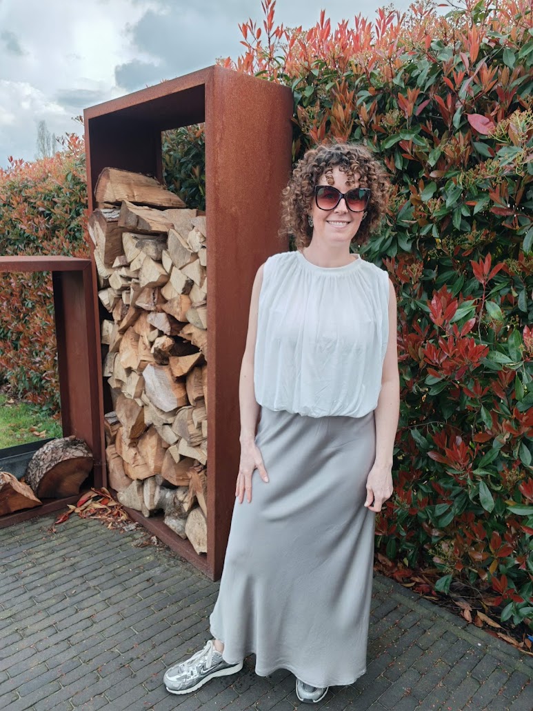 Soepelvallende satijnen rok in een lichtgrijze kleur.Draag hem casual met een t-shirt en een sneaker voor overdag.Draag hem gekleed met een blouse en een hakje voor een avondje uit.