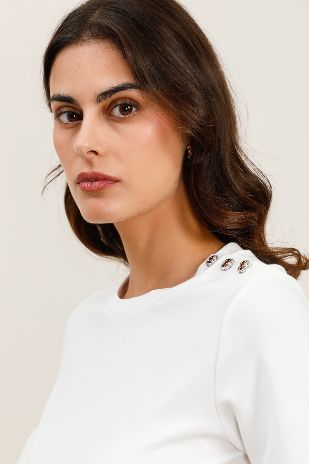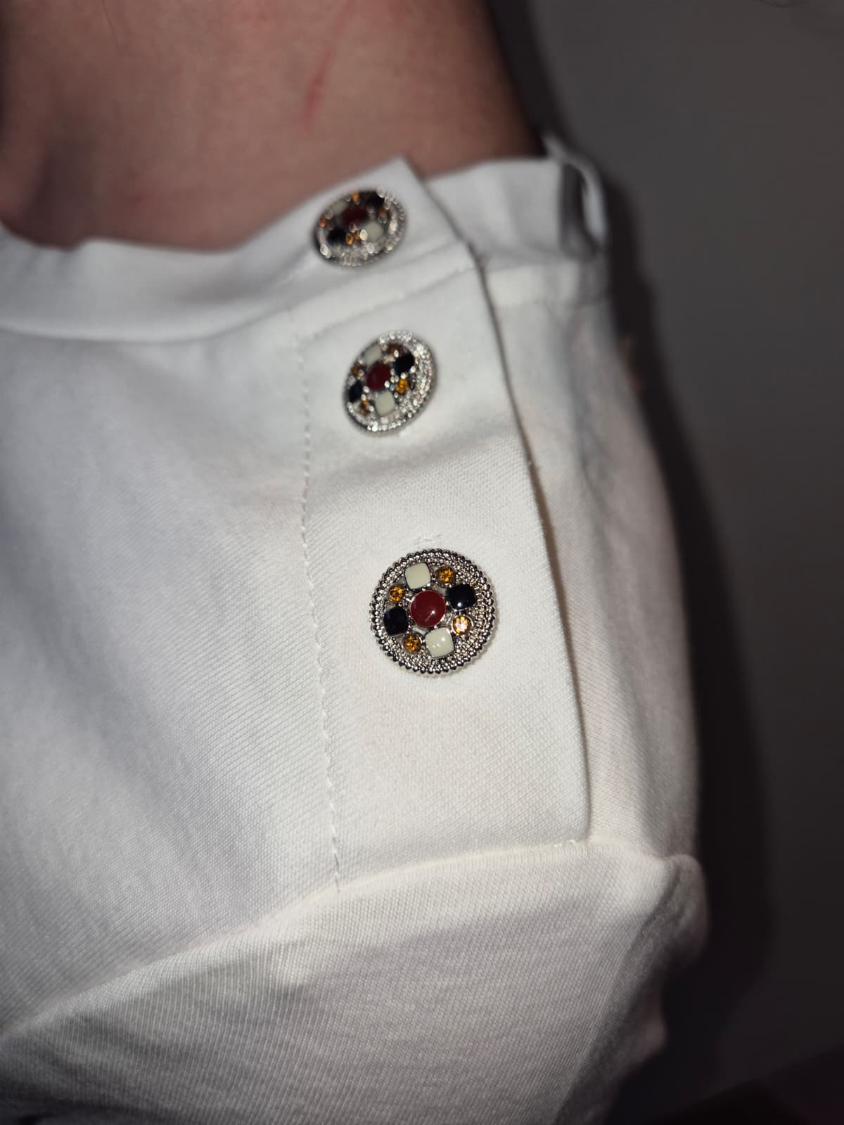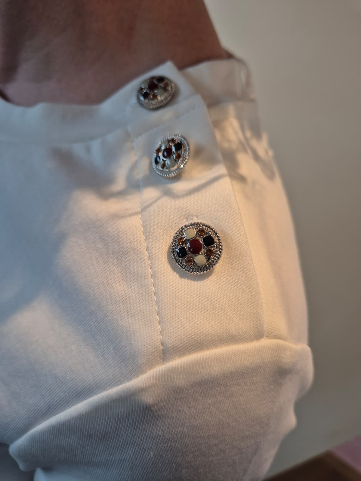 Op het eerste zicht een eenvoudig shirt, maar door de zilveren knoopjes met kleurtjes op de schouder, heeft het toch net dat tikkeltje meer.