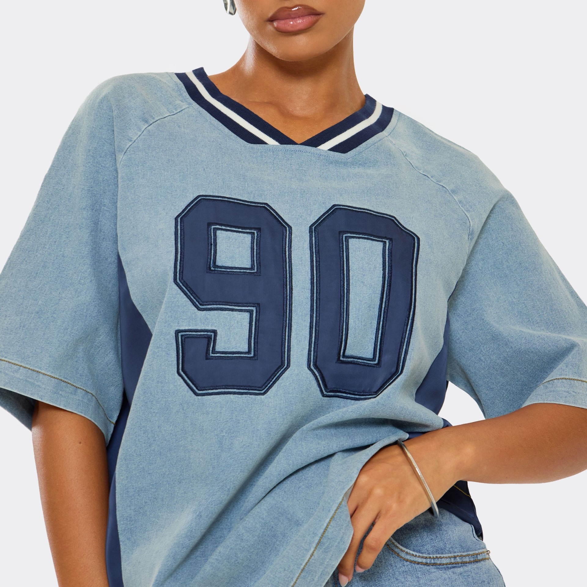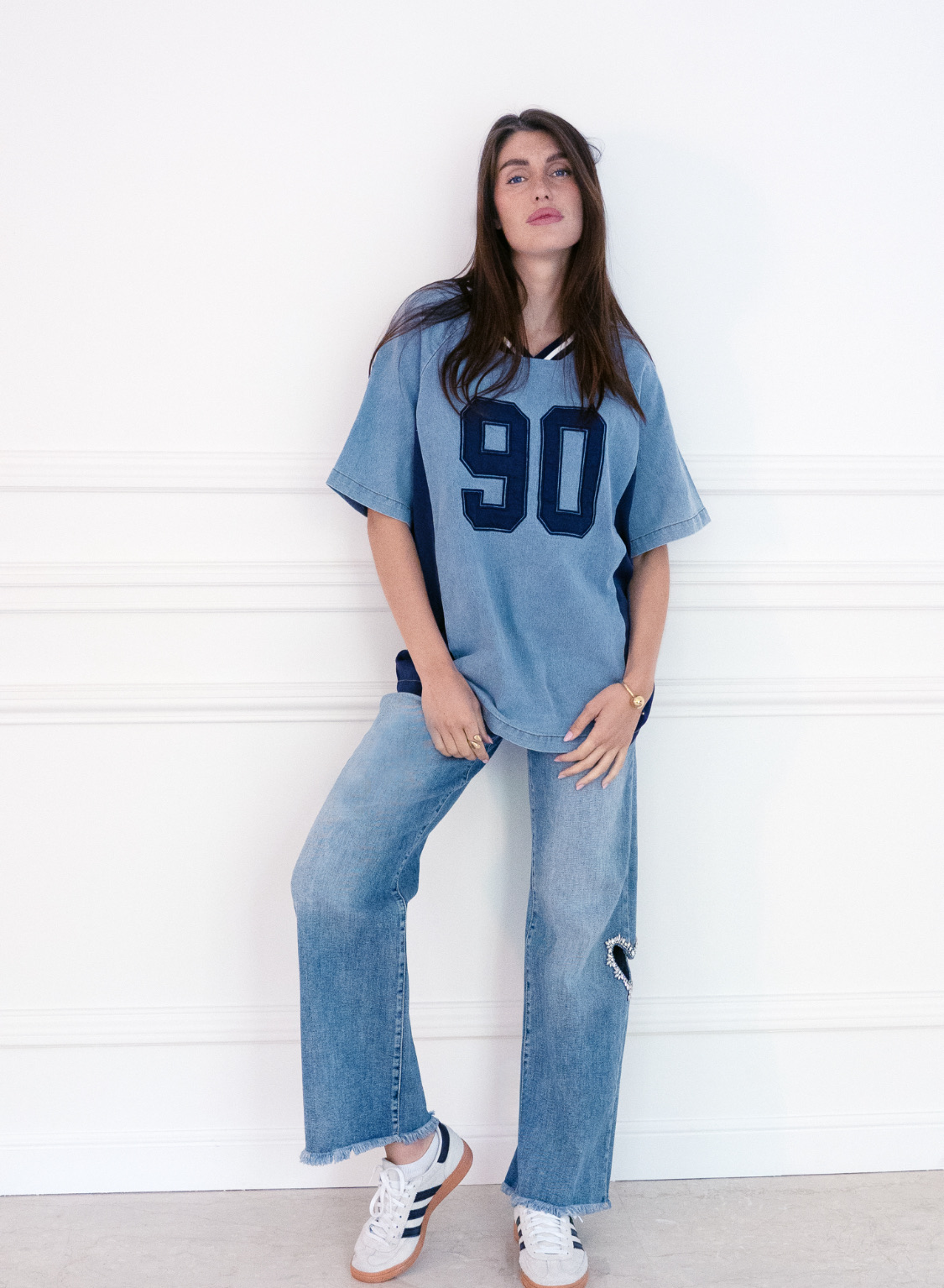 Supertof shirt met cijfers.Het shirt heeft een V-hals en satijnen boorden aan de zijkant.Hier wordt dit gecombineerd met onze blauwe lace.