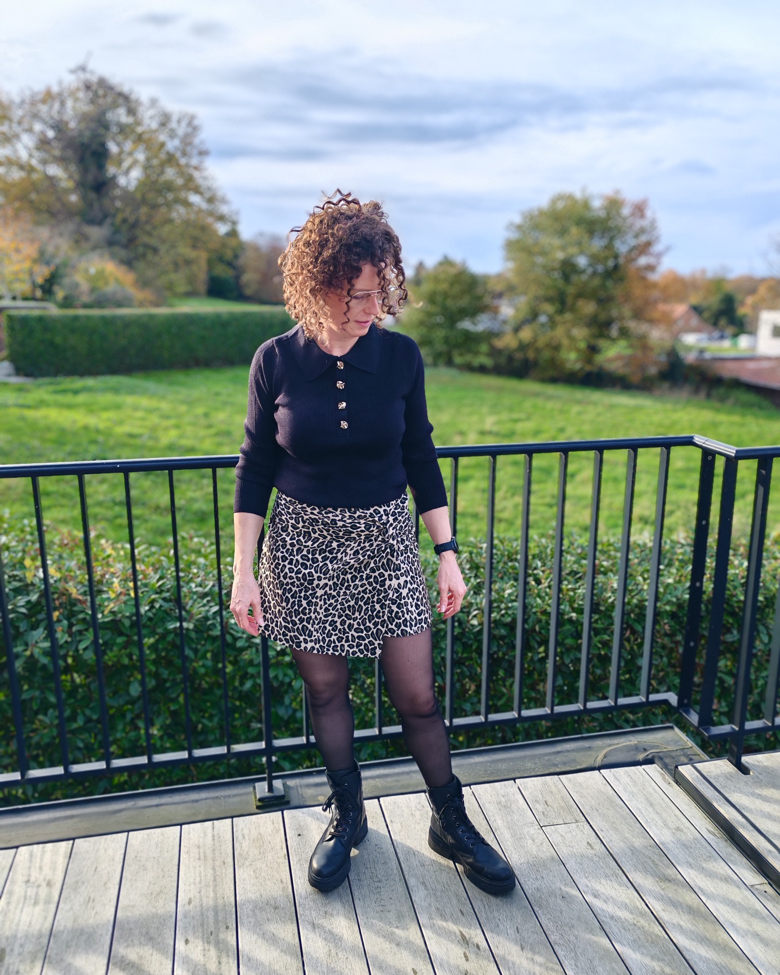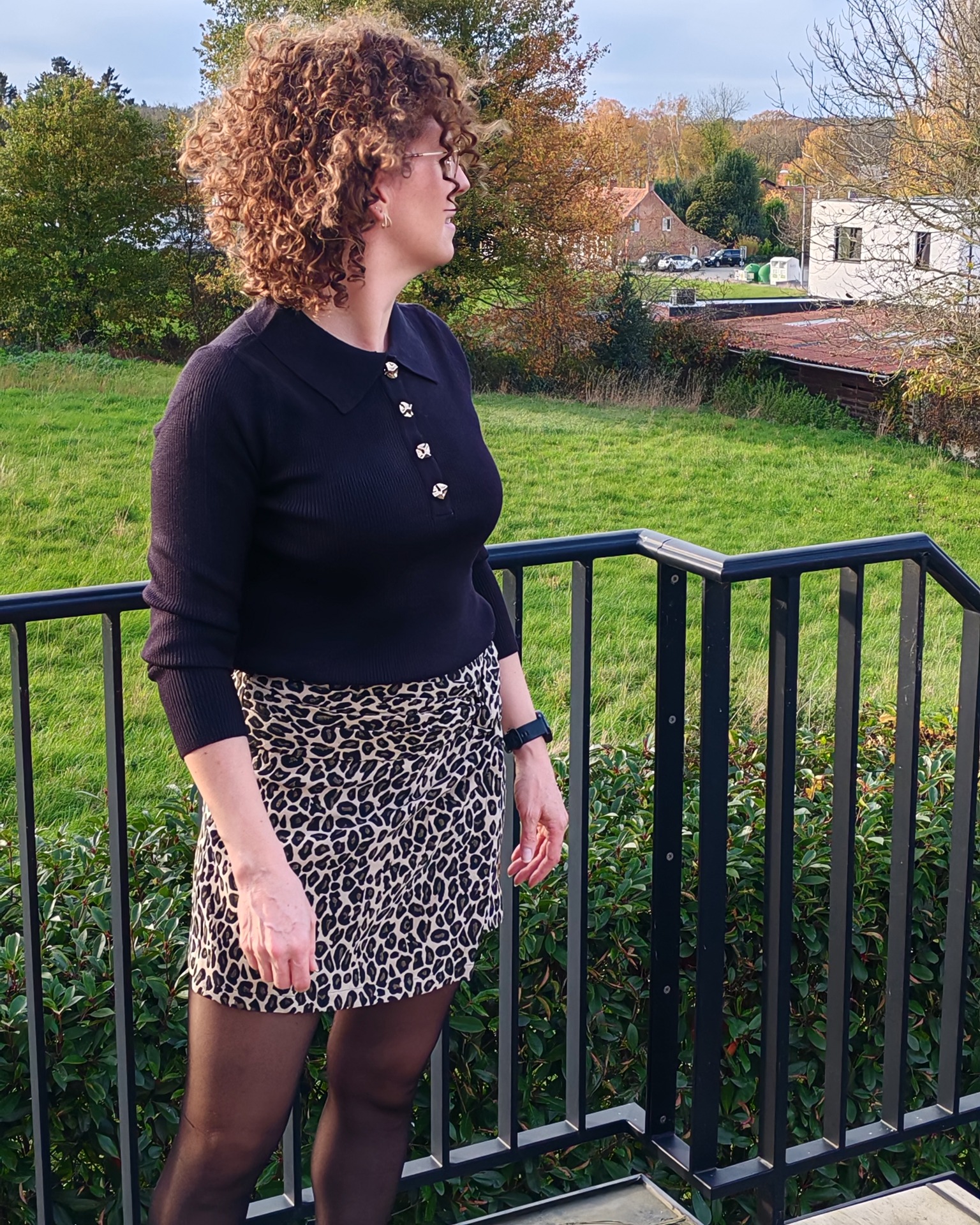 Toffe skort met een luipaardprint.Het uitzicht van een rokje, met het gemak van een short.Deze wordt hier gecombineerd met onze zwarte polo en blazer met details op de rug.