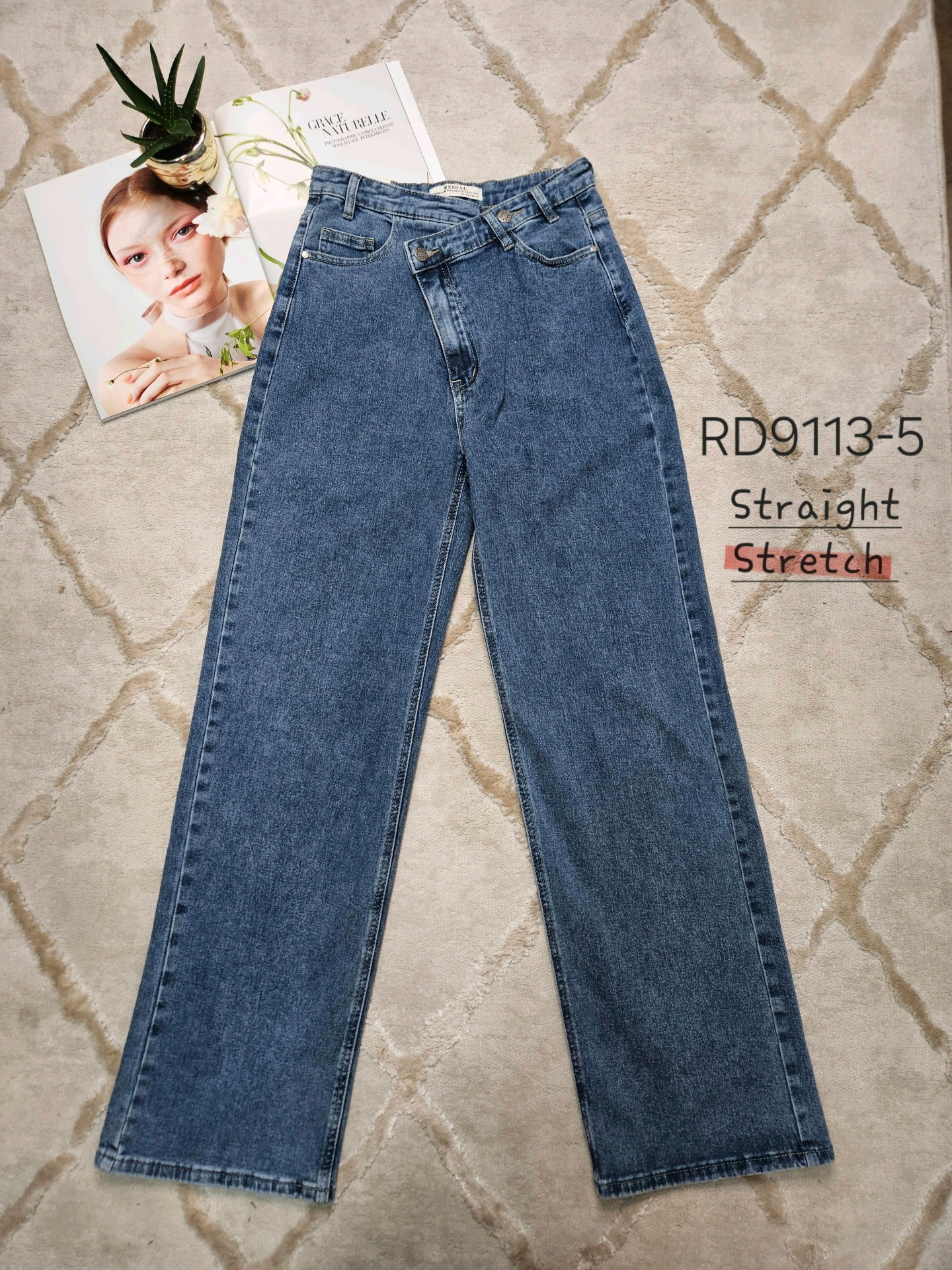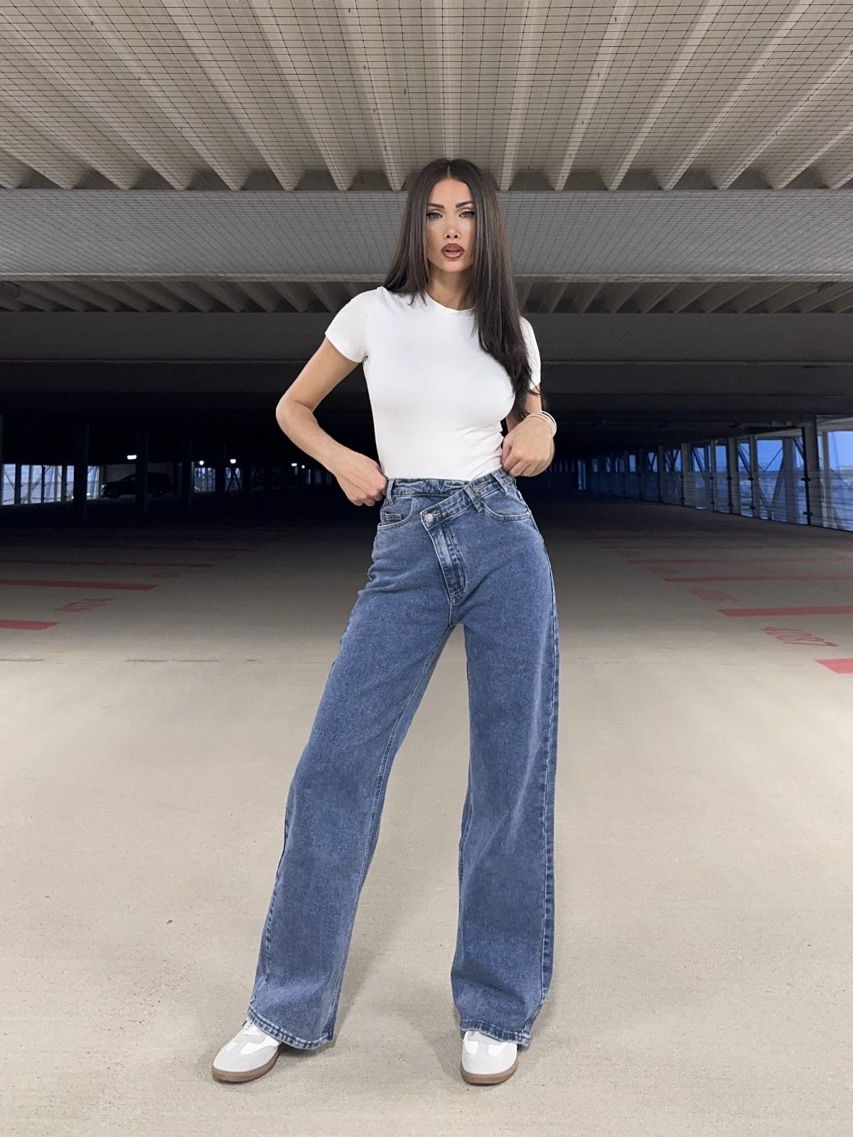Straight leg broek in een blauwe kleur met schuine knop voor een speciaal effect.