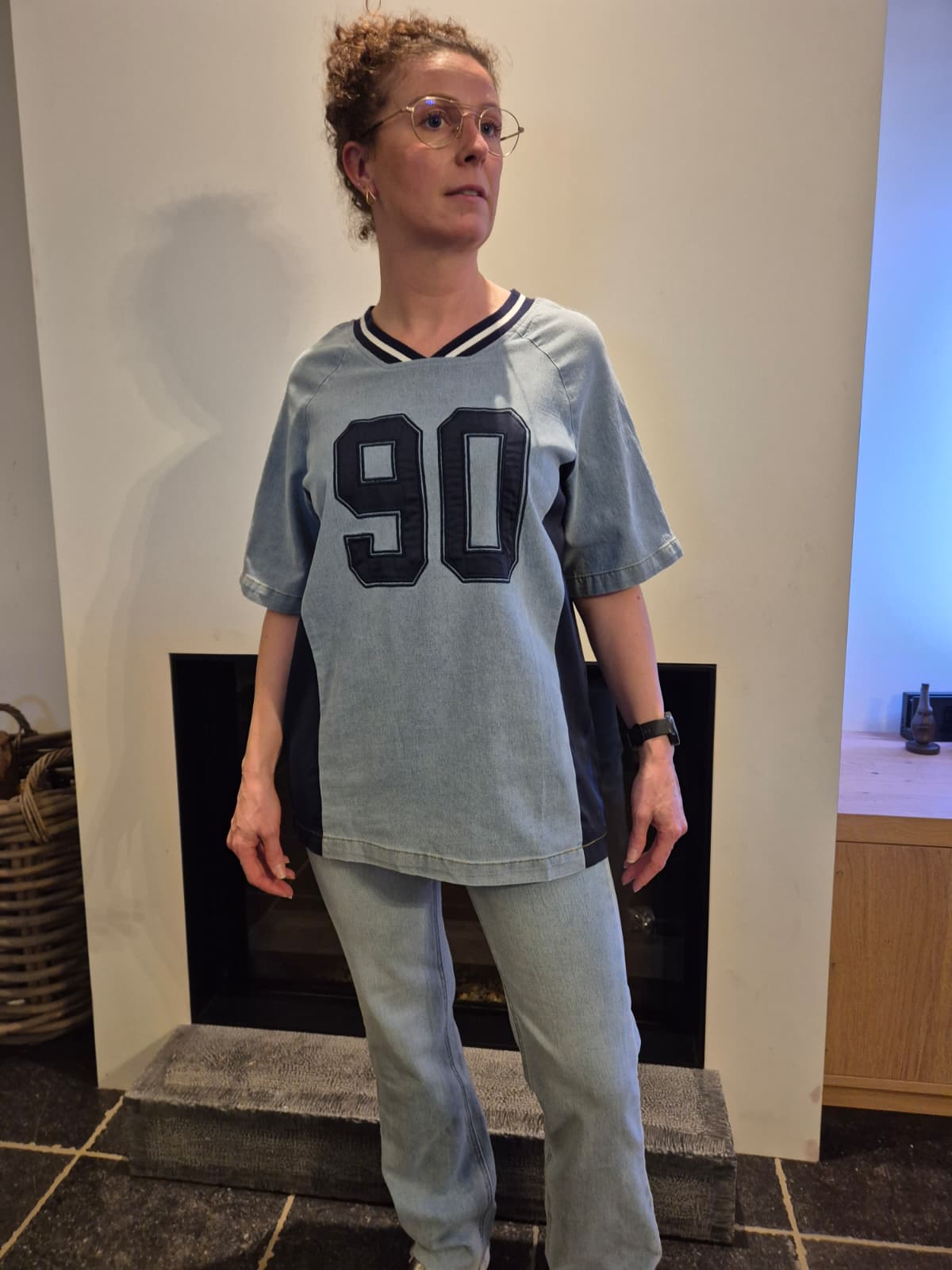 Rechte jeansbroek in een lichtblauwe kleur.De onderkant van de jeans het het uitzicht van een "afgeknipte" jeans.Hetty is 1m66 en draagt hier maat 36.