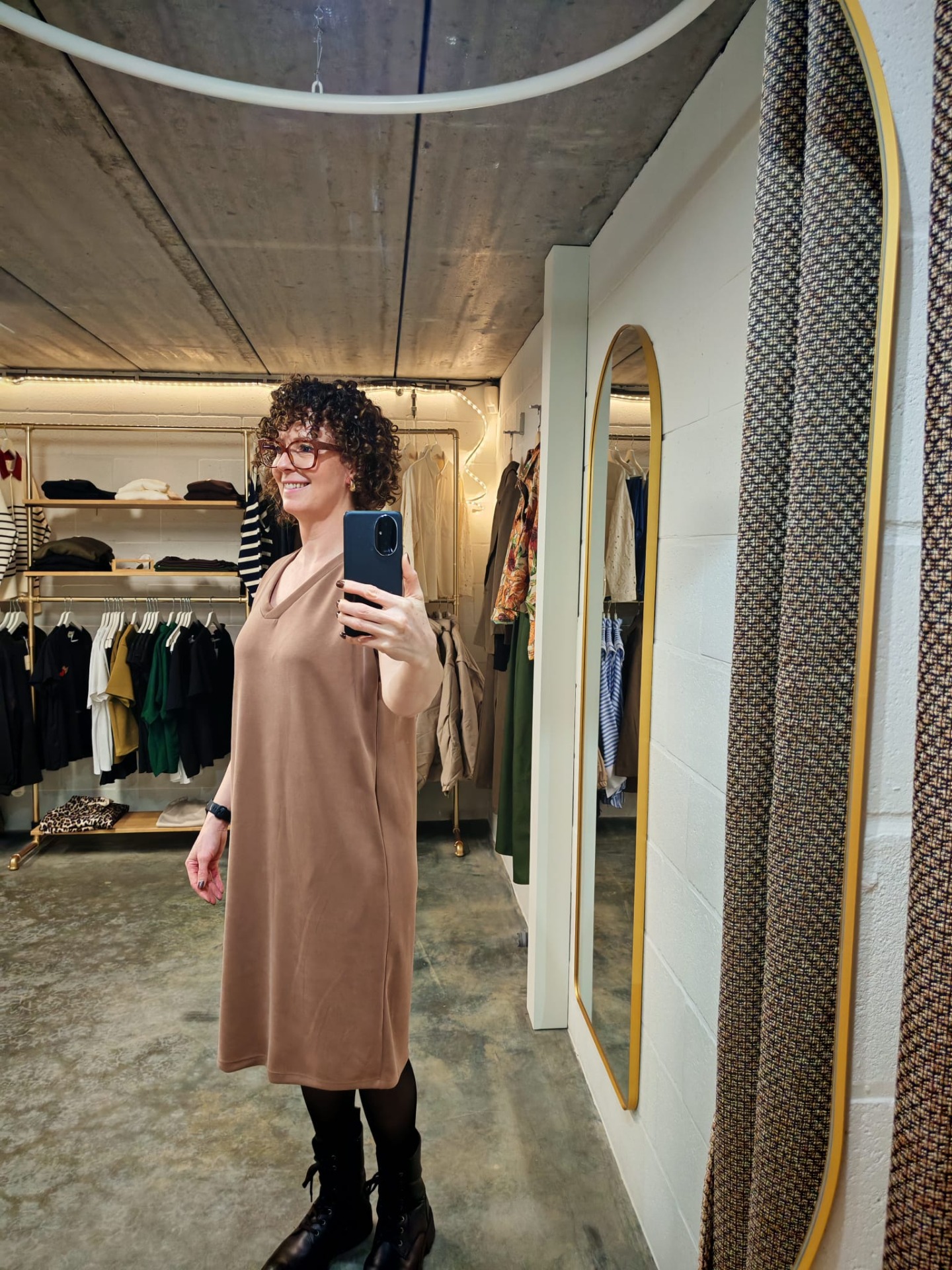 De jurk wordt hier gecombineerd met onze gouden ketting met verschillende bedels.