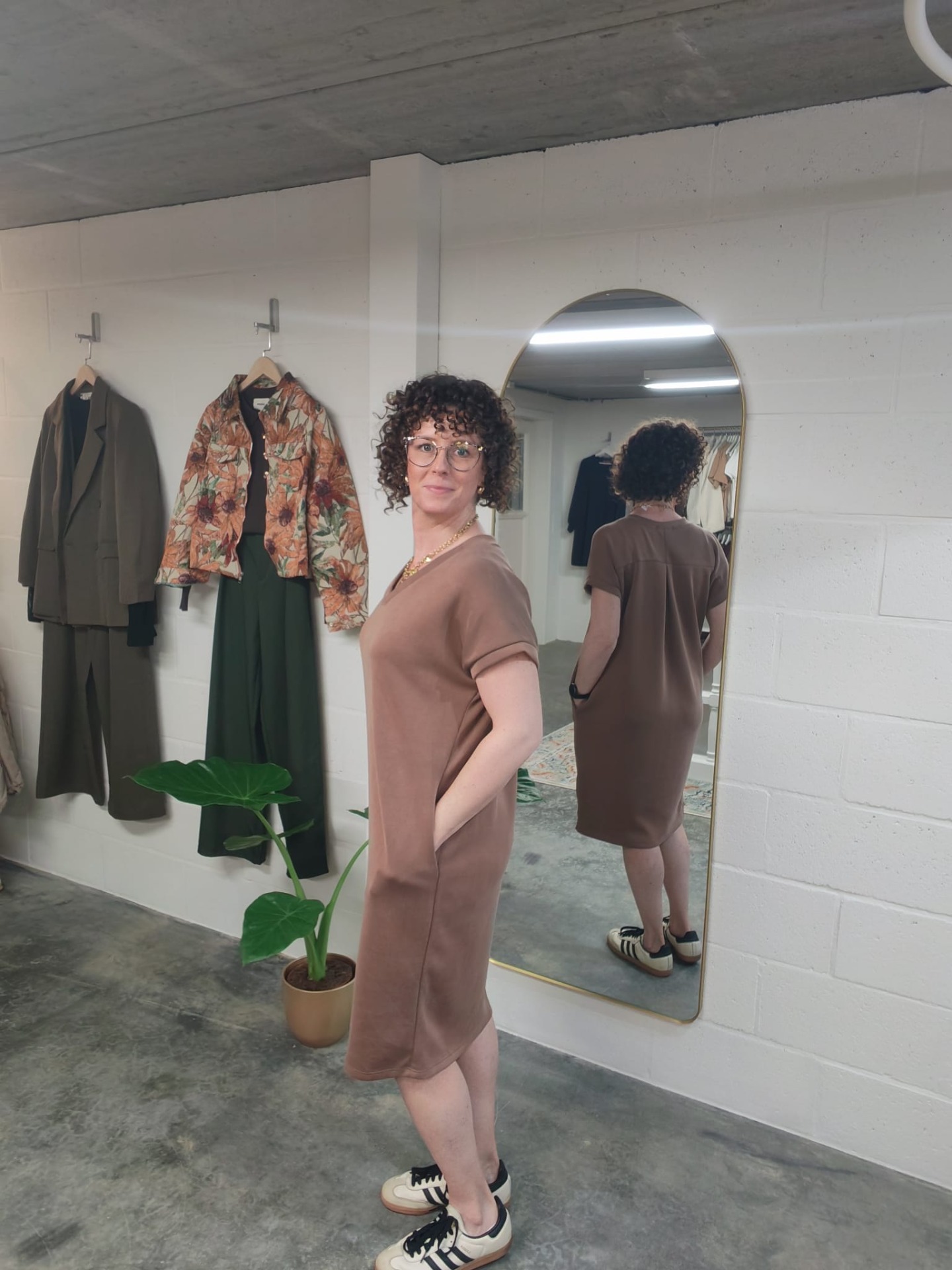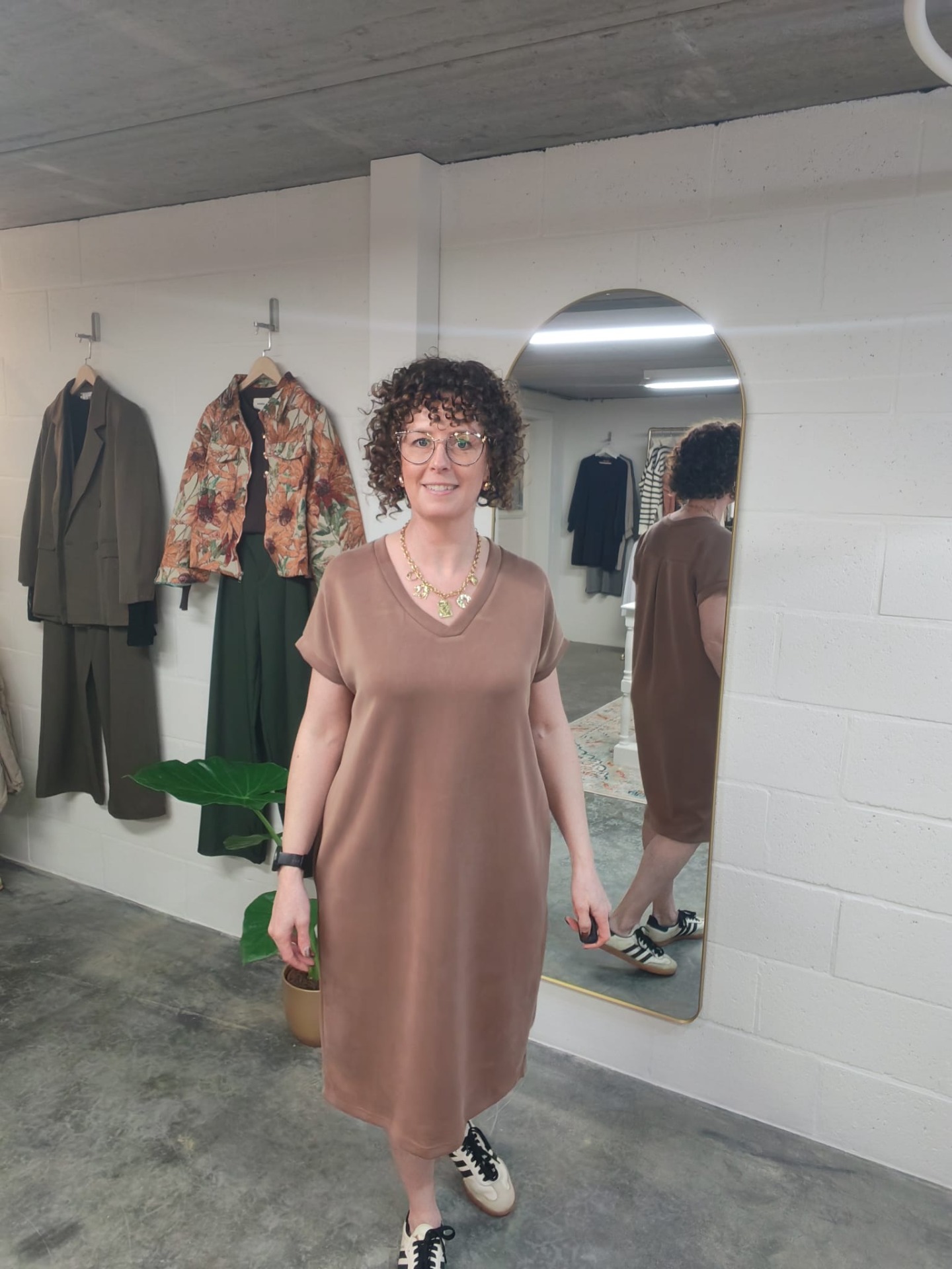 Leuk t-shirtjurk in een bruine kleur en met korte mouwen.