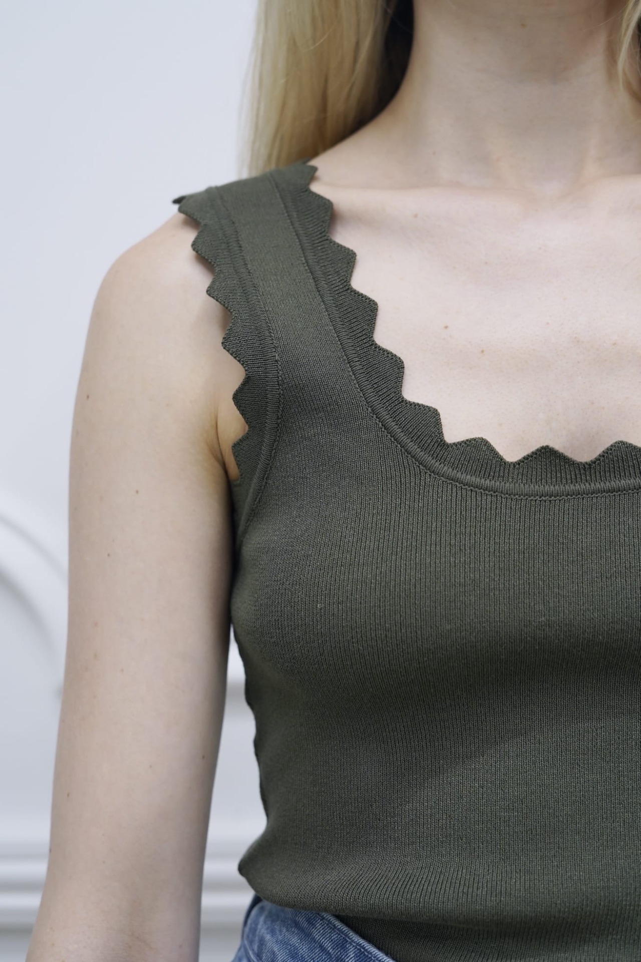 Leuk topje met gekartelde rand.Deze wordt hier gedragen op de groene broek en de gebloemde blazer.Ook tof om in de zomer te dragen op een leuke skort.