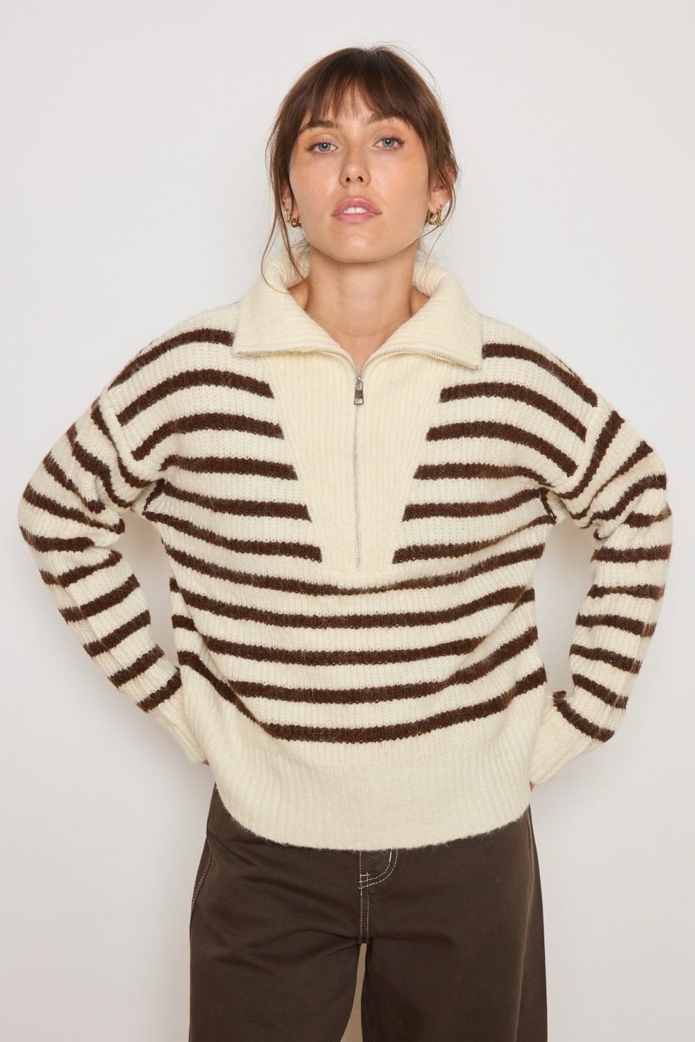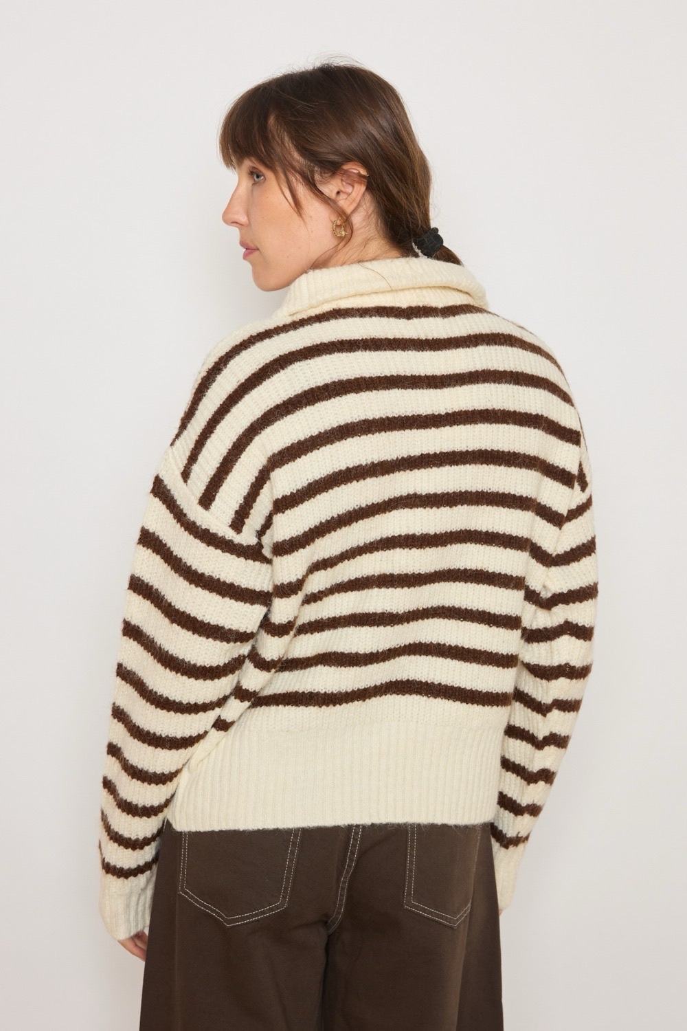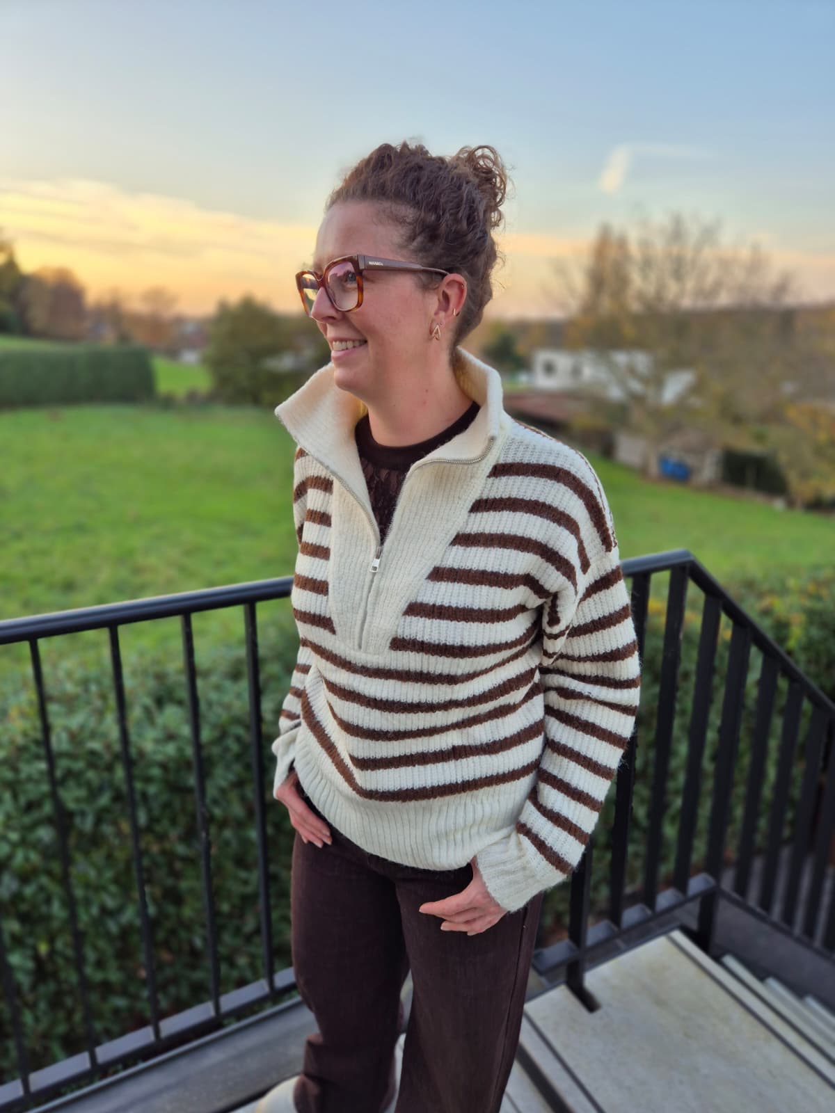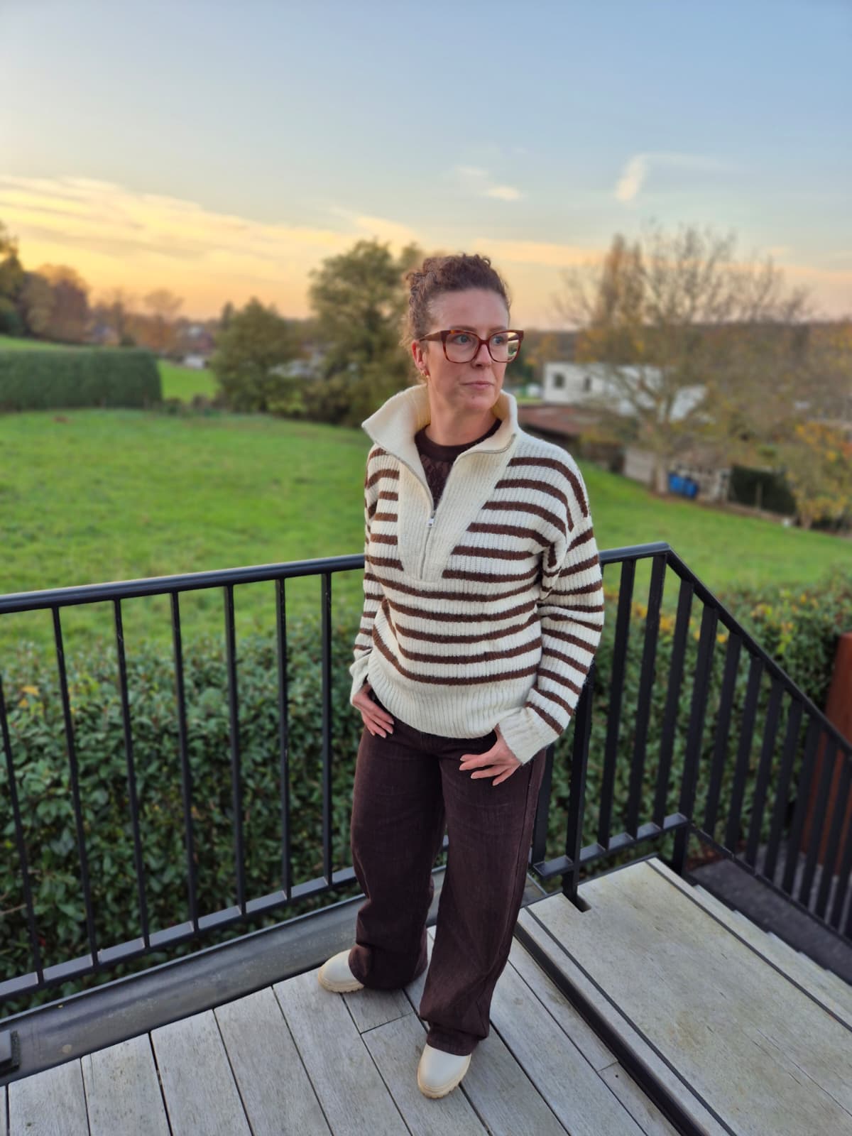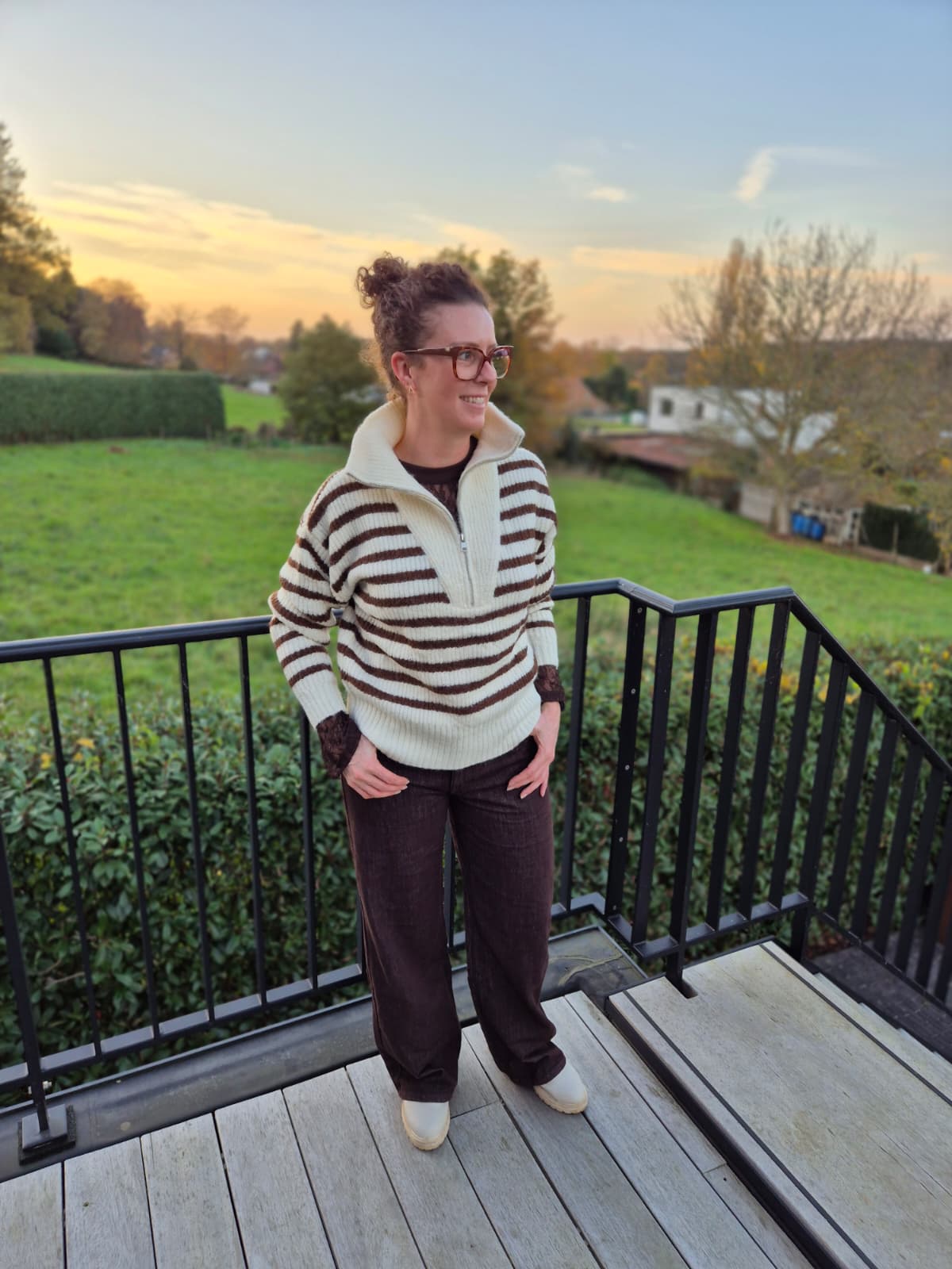 De trui wordt hier gedragen met onze oversized lace en onze bruine jeans wide leg.