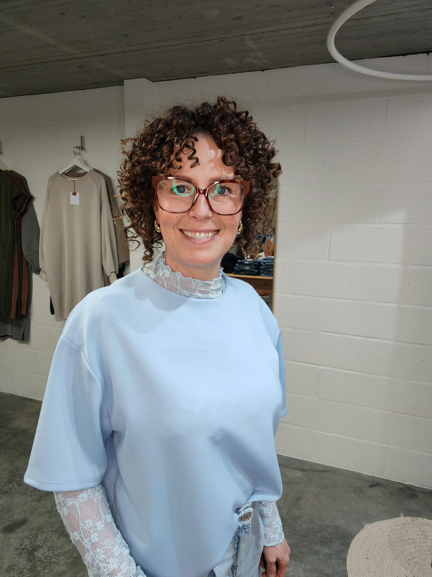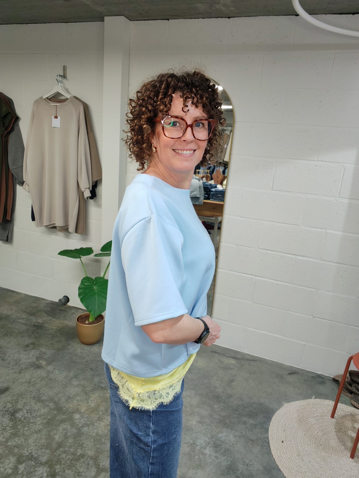 Zacht t-shirt in een blauwe kleur.Tof om te dragen op een jeans en af te werken met enkele opvallende juwelen.