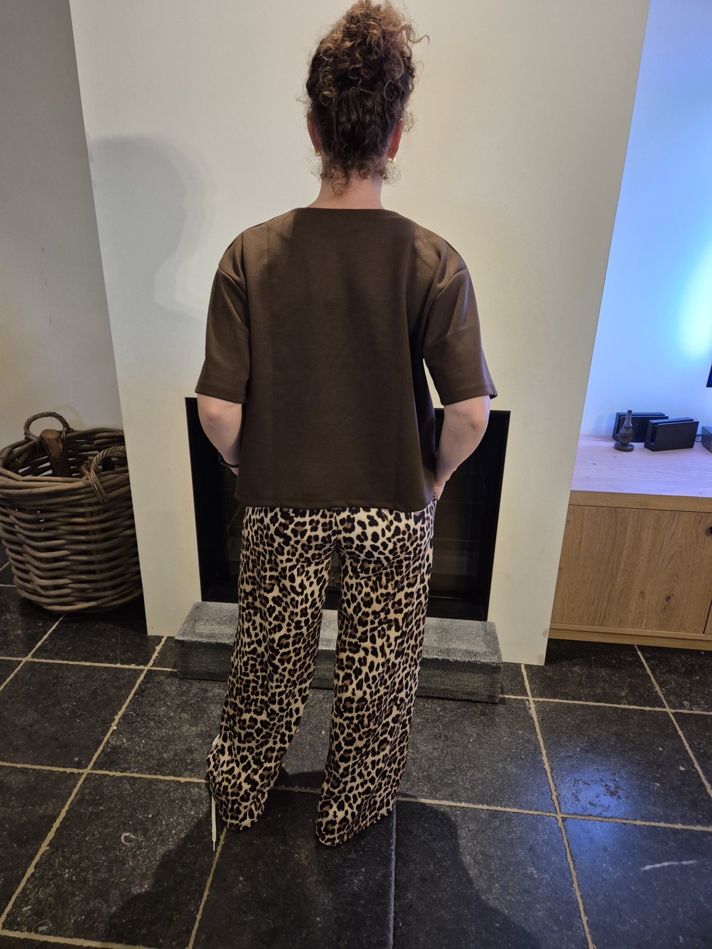 De broek wordt hier gedragen met het bruine t-shirt of de zwarte trui.