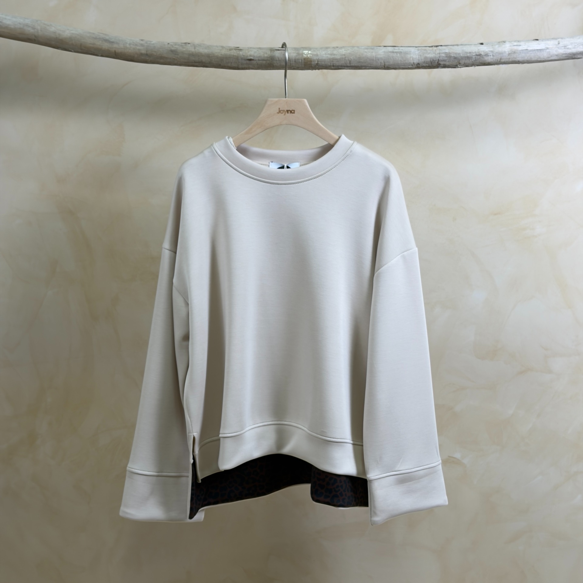 Zachte beige trui met aan de binnenkant van de mouw een leopardprint.