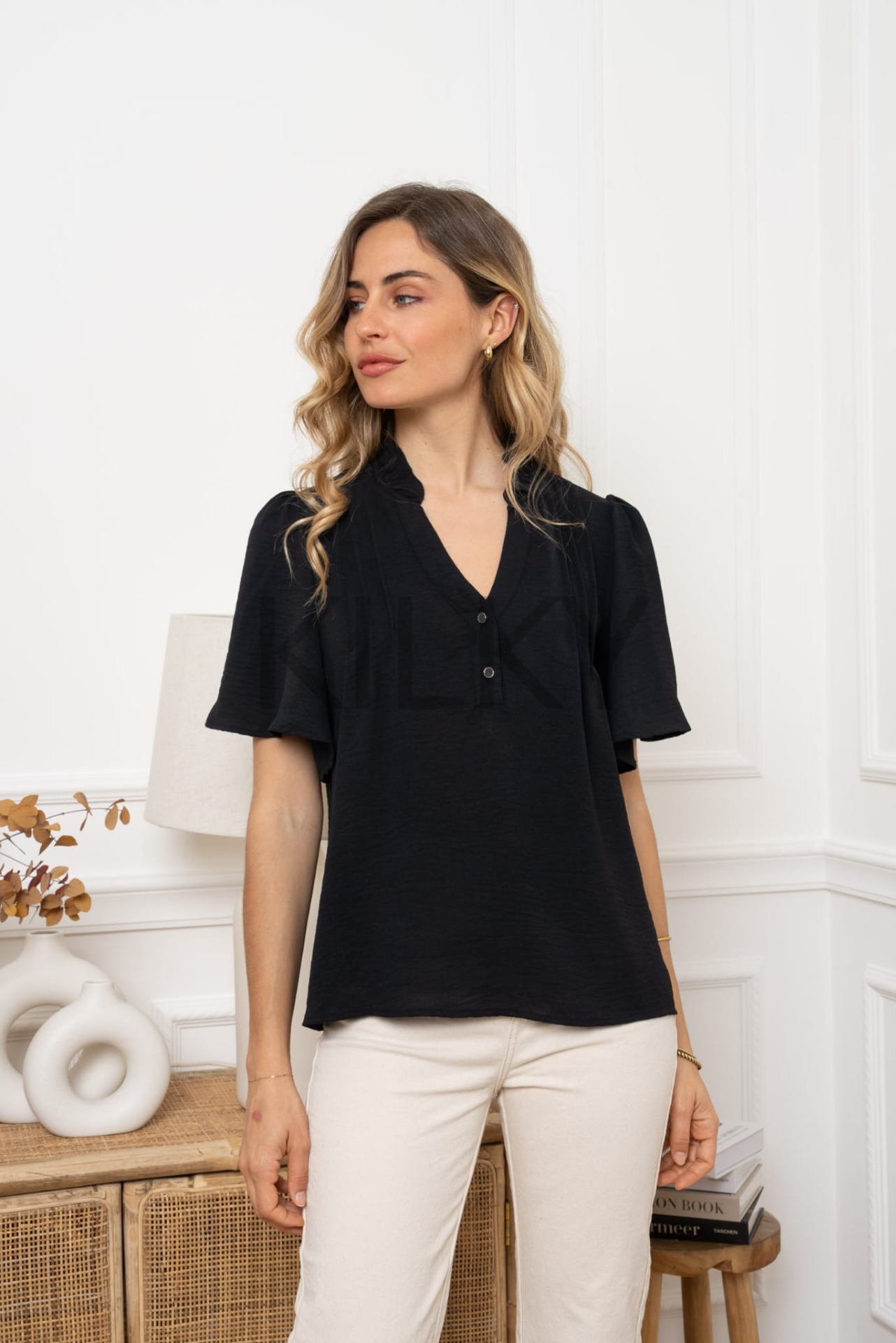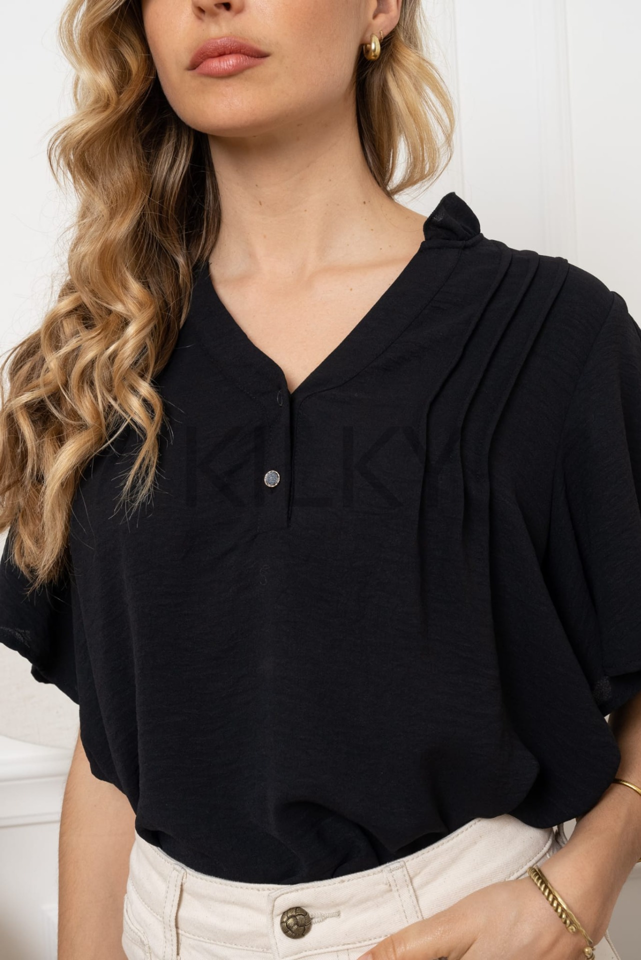 Eenvoudig shirt met bredere mouwen, knoopjes en een opstaand kraagje.
